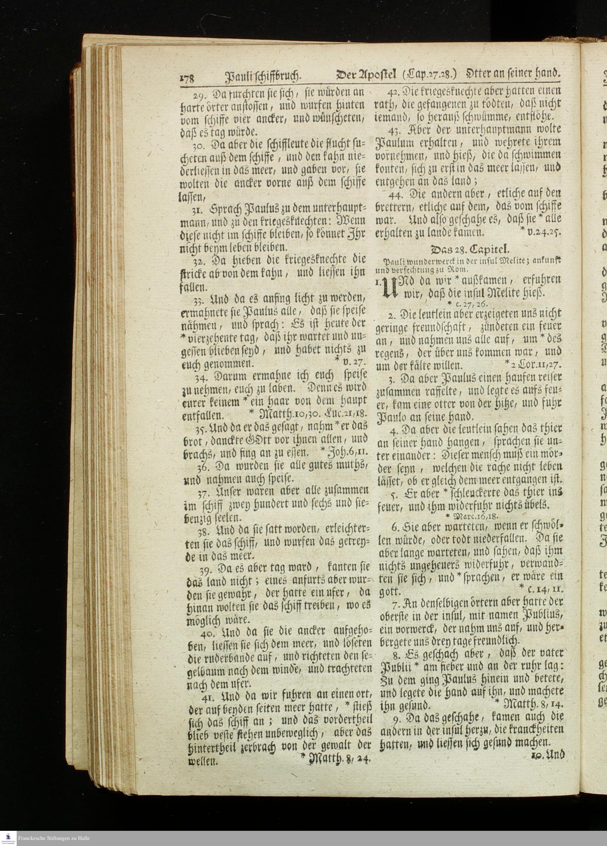 Biblia, Das ist: Die gantze Heil. Schrift Altes und Neues Testaments / Nach der Teutschen Ubersetzung D. Martin Luthers; Mit iedes Capitels kurtzen Summarien, auch beygefügten vielen und richtigen Parallelen; Mit fleiß übersehen/ und gegen einige/ sonderlich erstere/ Editiones des sel. Mannes gehalten, auch an unterschiedlichen Orten nach denselben eingerichtet, und von vielen in den bisherigen Exemplarien hin und wieder eingeschlichenen Fehlern gesaubert. Nebst einer Vorrede Herrn Baron Carl Hildebrands von Canstein.