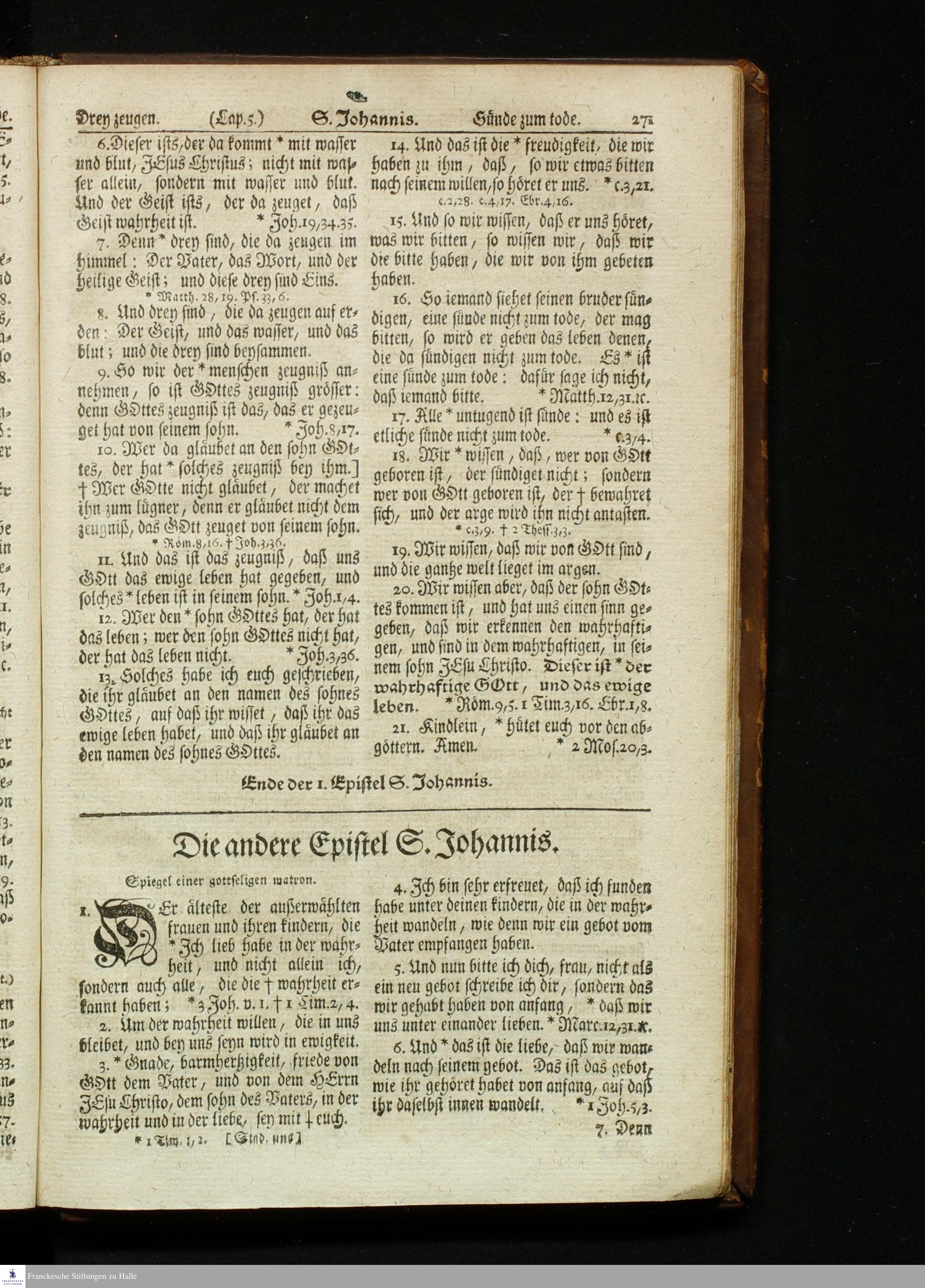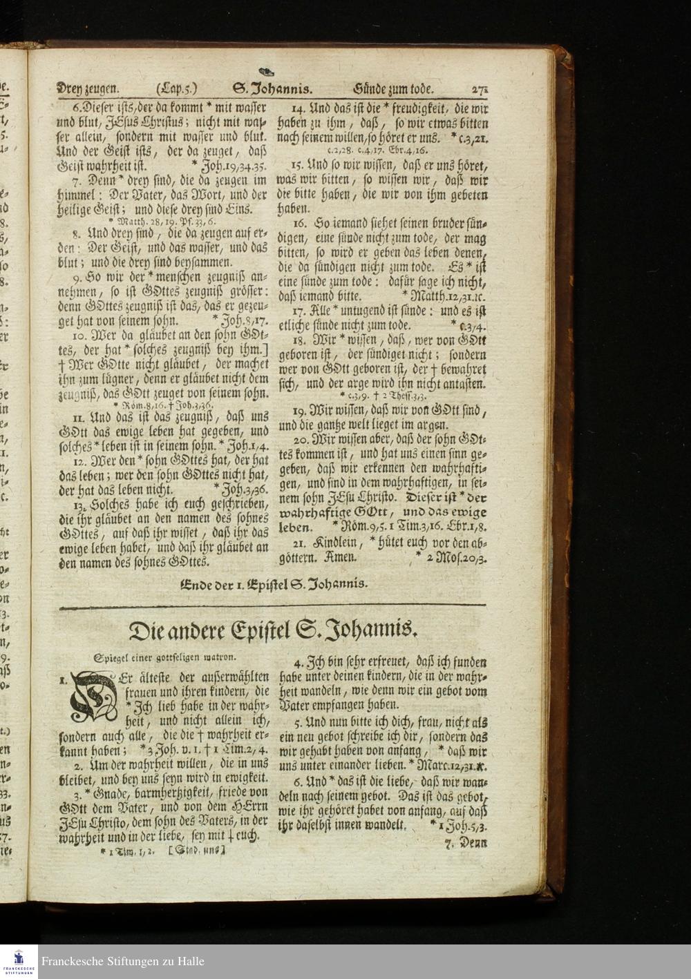 Biblia, Das ist: Die gantze Heil. Schrift Altes und Neues Testaments / Nach der Teutschen Ubersetzung D. Martin Luthers; Mit iedes Capitels kurtzen Summarien, auch beygefügten vielen und richtigen Parallelen; Mit fleiß übersehen/ und gegen einige/ sonderlich erstere/ Editiones des sel. Mannes gehalten, auch an unterschiedlichen Orten nach denselben eingerichtet, und von vielen in den bisherigen Exemplarien hin und wieder eingeschlichenen Fehlern gesaubert. Nebst einer Vorrede Herrn Baron Carl Hildebrands von Canstein.
