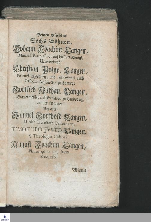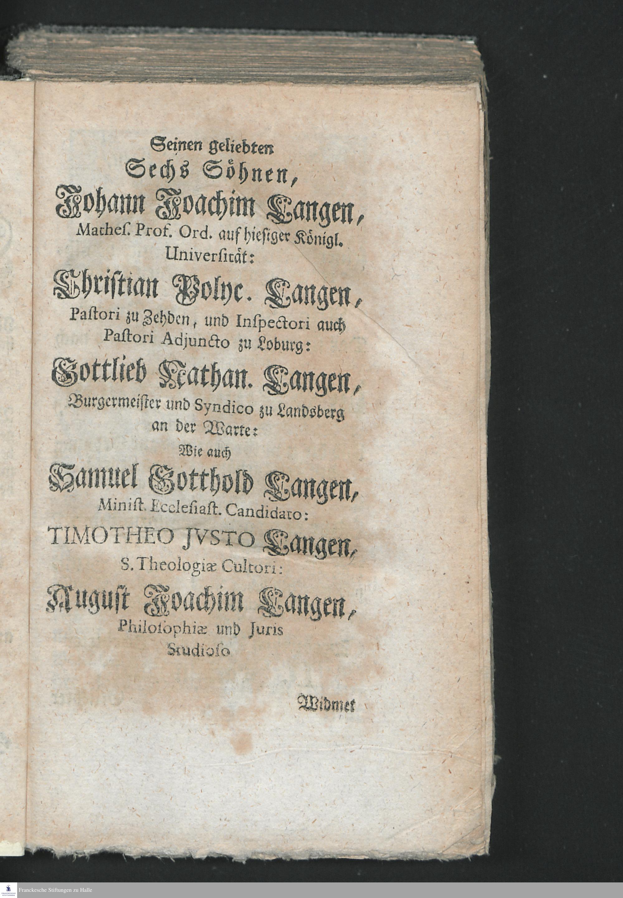 Ausführliche Einleitung in die Heil. Schrift : Darinn der Leser, Nach vorgetragener Lehre von der Unsterblichkeit der menschlichen Seele, erstlich wider die Atheisten, auf die natürliche Theologie und Religion ; Und hernach Von dieser wider die Naturalisten auf die geoffenbahrete Meßianische und Christliche ... Religion, mit Uberzeugung von der göttlichen Auctorität der heil. Schrift ... Zur Prüfung aller unrichtigen Lehr-Verfassungen geführet wird / Aus dem Mosaischen Licht und Recht auf Verlangen zum gemeinen Gebrauch besonders ausgefertiget Von D. Joachim Langen, S. Theol. Prof. Ord.