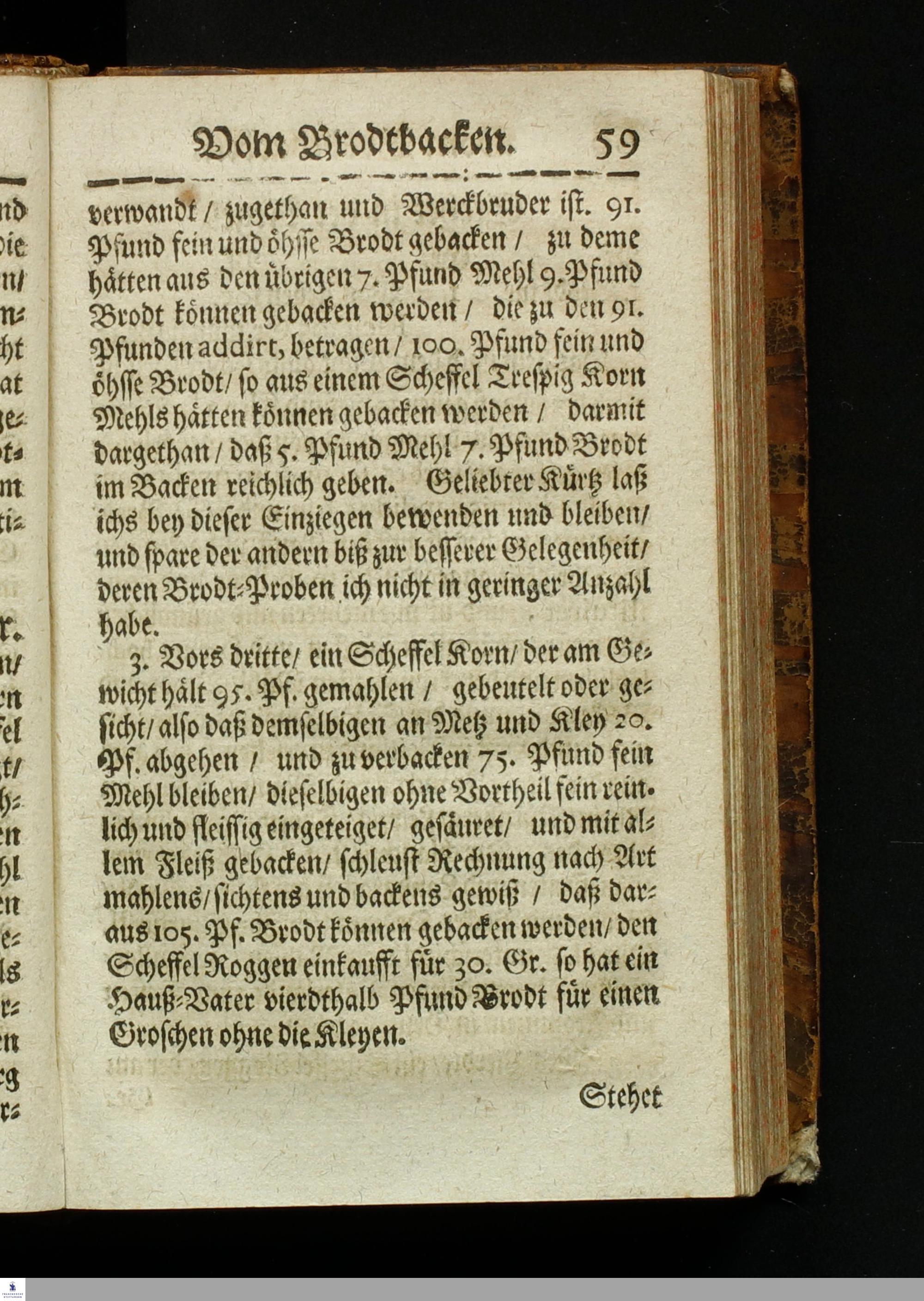 Bericht Vom Brodt-Backen/ Fundiret und gerichtet auff die Substantz/ Natur/ Eigenschafft und Gütigkeit des Fruchtwachs/ und dann nach Art treulichen/ fleißigen vollnständigen mahlens/ sichtens einteigens/ säurens und backens : Dem gemeinem Vaterland/ gemeiner Wolfart/ und lieben Armuth zu sonderm Nutz und Frommen in Druck gegeben: Allen Proviantmeistern/ Verwaltern/ Haußhaltern und Haußvätern sehr nützlich und vorträglich zu wissen / Gestellet durch Sebaldum Müllern/ Bürgern zu Königsberg in Preussen