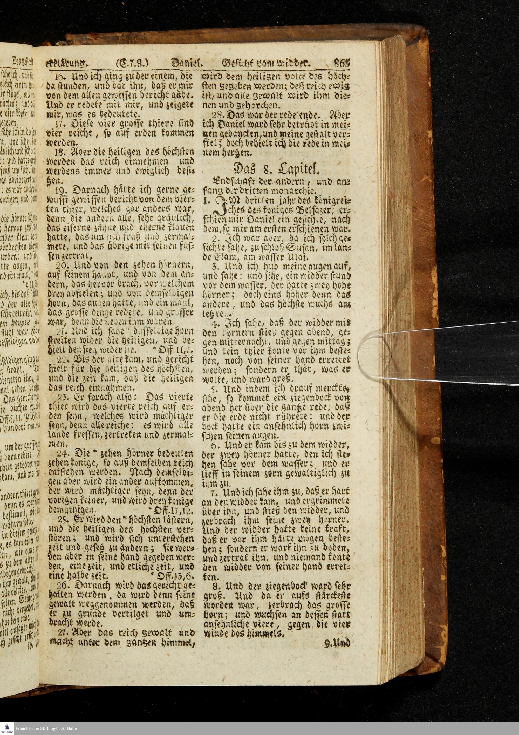 Biblia, Das ist: Die gantze Heil. Schrift Altes und Neues Testaments / Nach der Teutschen Ubersetzung D. Martin Luthers; Mit iedes Capitels kurtzen Summarien/ auch beygefügten vielen und richtigen Parallelen; Mit Fleiß übersehen, Und gegen einige/ sonderlich erstere/ Editiones des sel. Mannes gehalten, auch an unterschiedlichen Orten nach denselben eingerichtet, und von vielen in den bisherigen Exemplarien hin und wieder eingeschlichenen druckfehlern gesaubert. Nebst einer Vorrede Hn. Baron Carl Hildebrands v. Canstein.