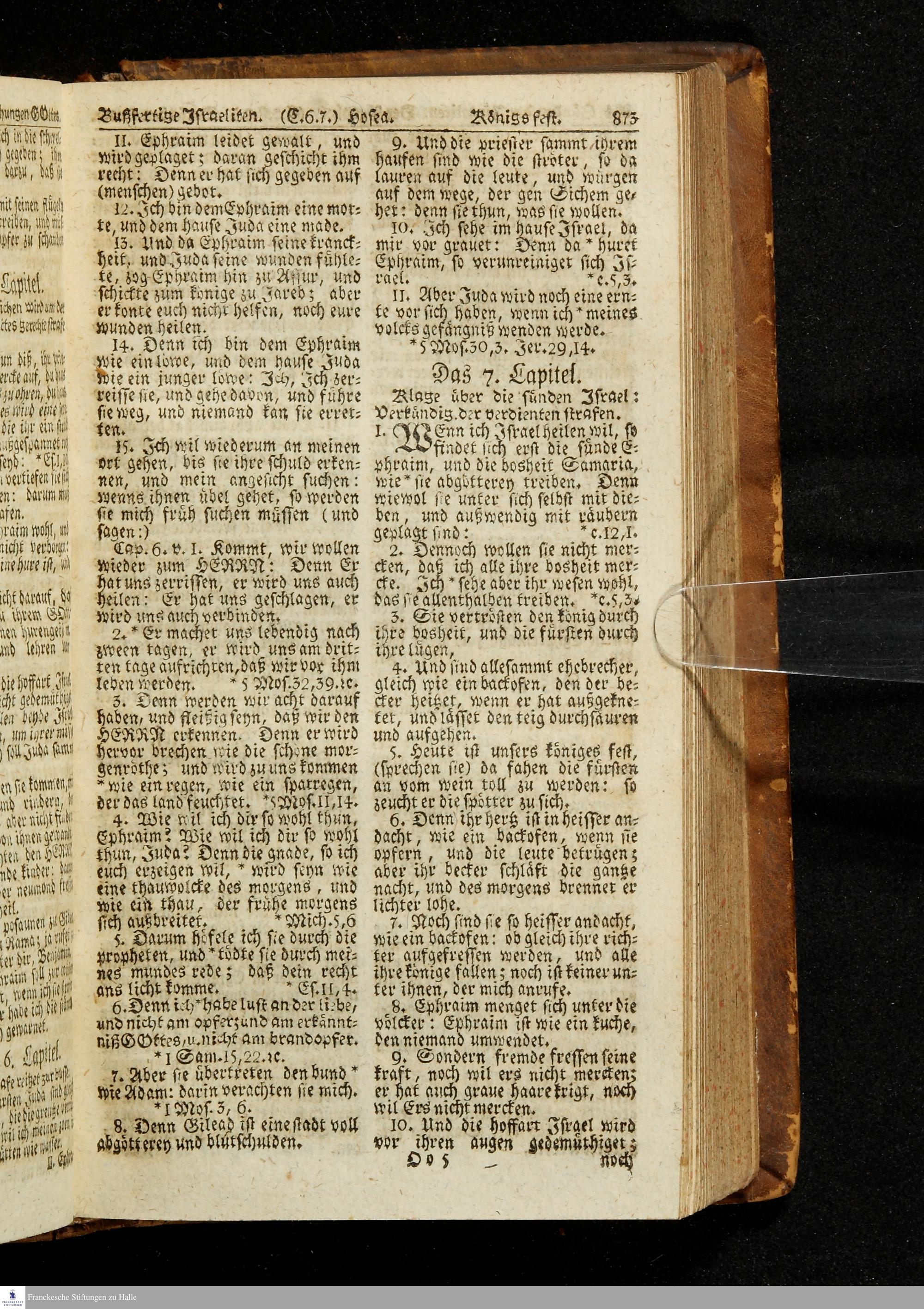 Biblia, Das ist: Die gantze Heil. Schrift Altes und Neues Testaments / Nach der Teutschen Ubersetzung D. Martin Luthers; Mit iedes Capitels kurtzen Summarien/ auch beygefügten vielen und richtigen Parallelen; Mit Fleiß übersehen, Und gegen einige/ sonderlich erstere/ Editiones des sel. Mannes gehalten, auch an unterschiedlichen Orten nach denselben eingerichtet, und von vielen in den bisherigen Exemplarien hin und wieder eingeschlichenen druckfehlern gesaubert. Nebst einer Vorrede Hn. Baron Carl Hildebrands v. Canstein.