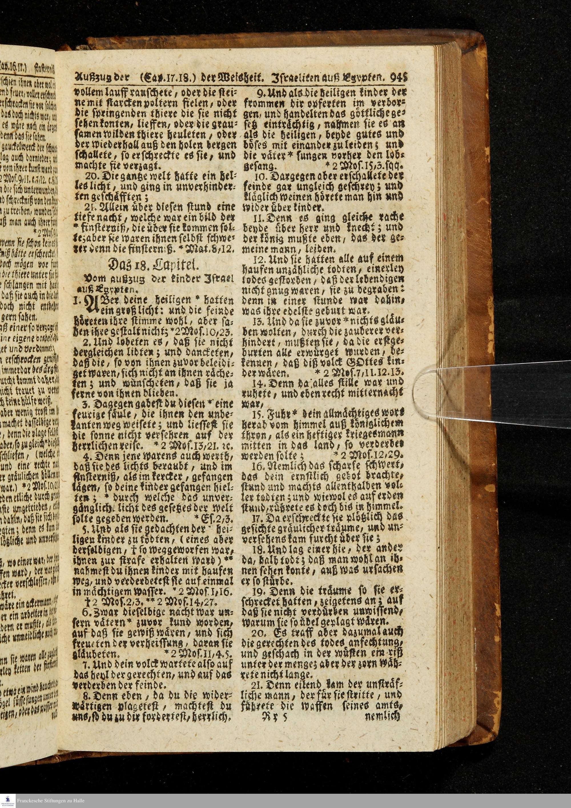 Biblia, Das ist: Die gantze Heil. Schrift Altes und Neues Testaments / Nach der Teutschen Ubersetzung D. Martin Luthers; Mit iedes Capitels kurtzen Summarien/ auch beygefügten vielen und richtigen Parallelen; Mit Fleiß übersehen, Und gegen einige/ sonderlich erstere/ Editiones des sel. Mannes gehalten, auch an unterschiedlichen Orten nach denselben eingerichtet, und von vielen in den bisherigen Exemplarien hin und wieder eingeschlichenen druckfehlern gesaubert. Nebst einer Vorrede Hn. Baron Carl Hildebrands v. Canstein.