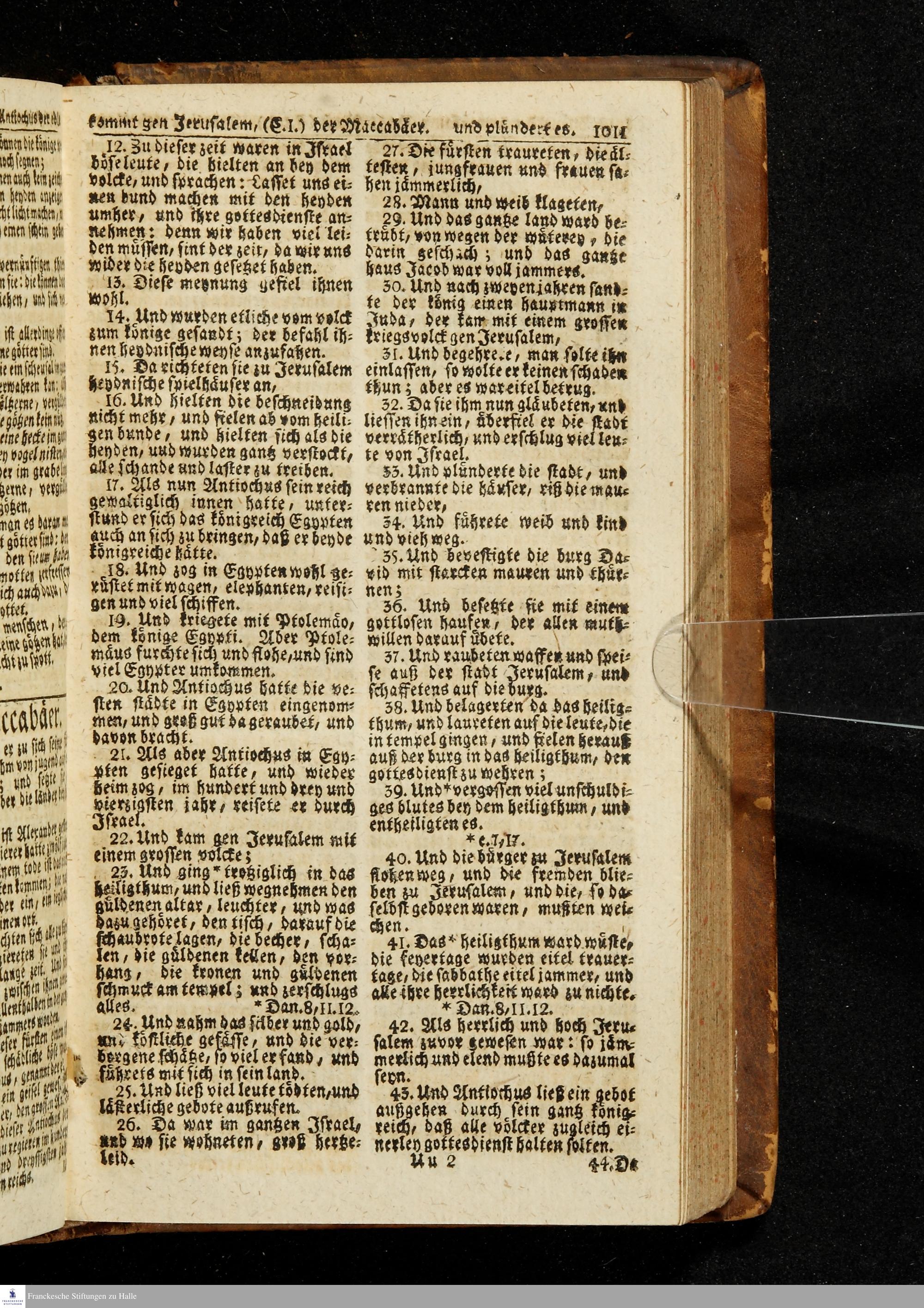 Biblia, Das ist: Die gantze Heil. Schrift Altes und Neues Testaments / Nach der Teutschen Ubersetzung D. Martin Luthers; Mit iedes Capitels kurtzen Summarien/ auch beygefügten vielen und richtigen Parallelen; Mit Fleiß übersehen, Und gegen einige/ sonderlich erstere/ Editiones des sel. Mannes gehalten, auch an unterschiedlichen Orten nach denselben eingerichtet, und von vielen in den bisherigen Exemplarien hin und wieder eingeschlichenen druckfehlern gesaubert. Nebst einer Vorrede Hn. Baron Carl Hildebrands v. Canstein.