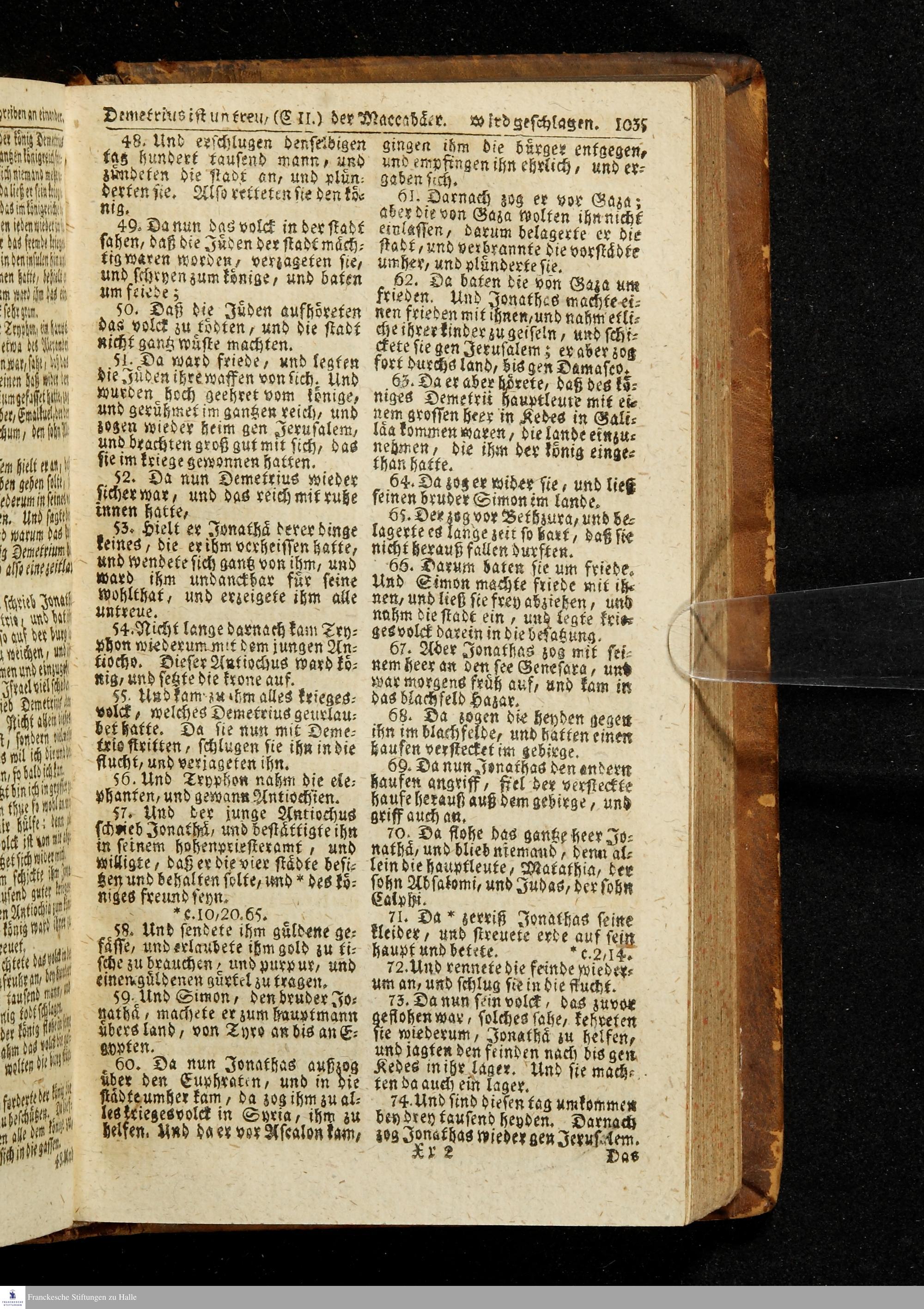 Biblia, Das ist: Die gantze Heil. Schrift Altes und Neues Testaments / Nach der Teutschen Ubersetzung D. Martin Luthers; Mit iedes Capitels kurtzen Summarien/ auch beygefügten vielen und richtigen Parallelen; Mit Fleiß übersehen, Und gegen einige/ sonderlich erstere/ Editiones des sel. Mannes gehalten, auch an unterschiedlichen Orten nach denselben eingerichtet, und von vielen in den bisherigen Exemplarien hin und wieder eingeschlichenen druckfehlern gesaubert. Nebst einer Vorrede Hn. Baron Carl Hildebrands v. Canstein.