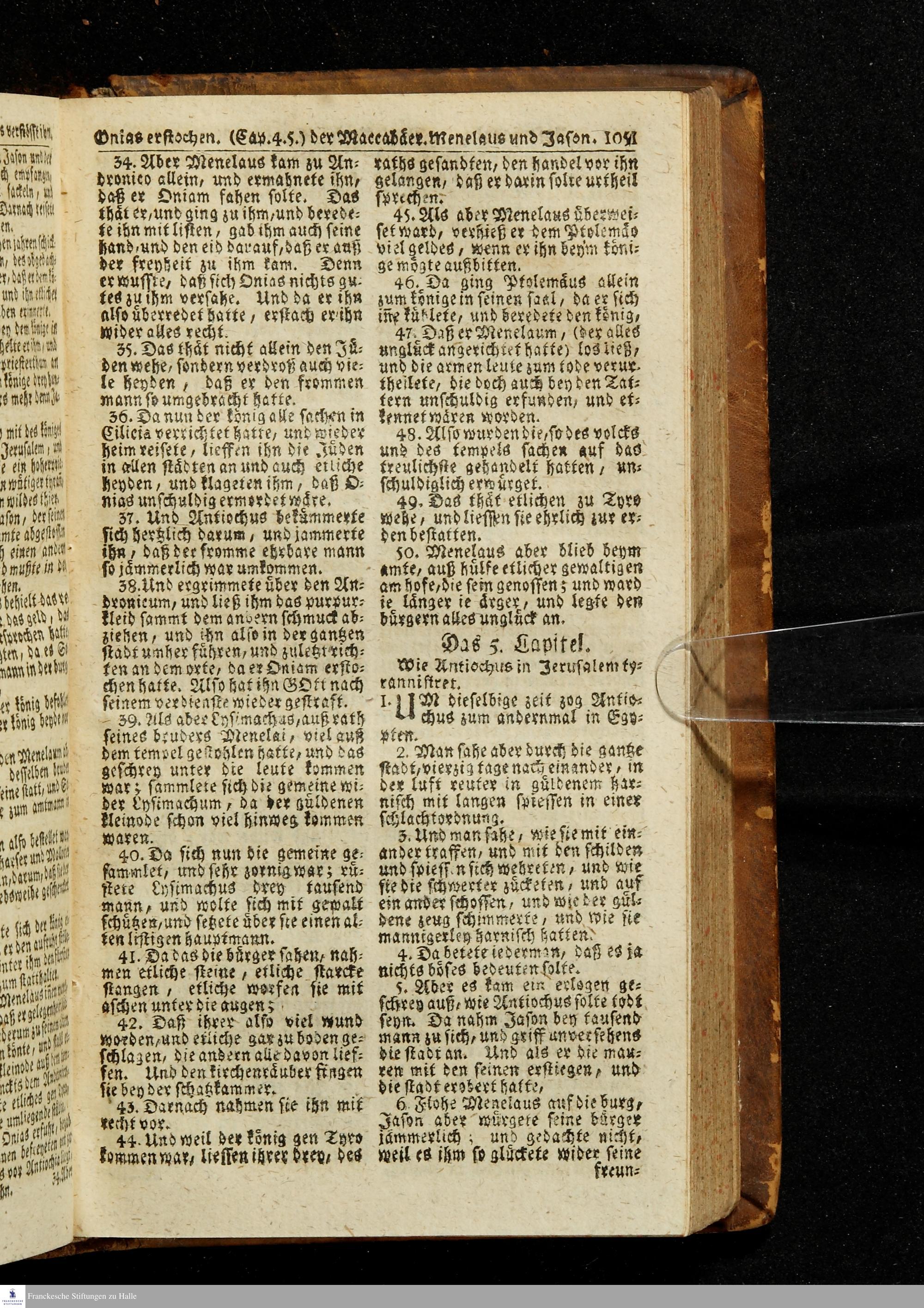 Biblia, Das ist: Die gantze Heil. Schrift Altes und Neues Testaments / Nach der Teutschen Ubersetzung D. Martin Luthers; Mit iedes Capitels kurtzen Summarien/ auch beygefügten vielen und richtigen Parallelen; Mit Fleiß übersehen, Und gegen einige/ sonderlich erstere/ Editiones des sel. Mannes gehalten, auch an unterschiedlichen Orten nach denselben eingerichtet, und von vielen in den bisherigen Exemplarien hin und wieder eingeschlichenen druckfehlern gesaubert. Nebst einer Vorrede Hn. Baron Carl Hildebrands v. Canstein.