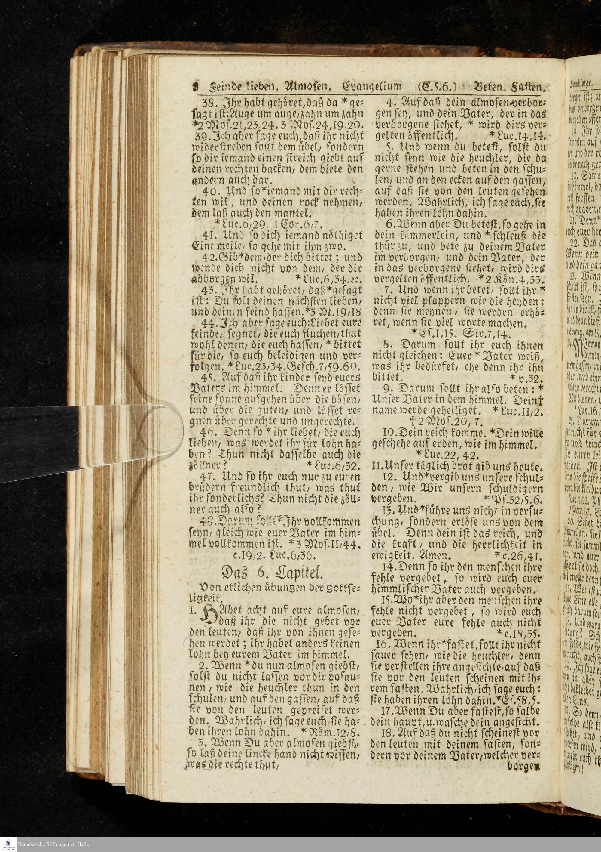Biblia, Das ist: Die gantze Heil. Schrift Altes und Neues Testaments / Nach der Teutschen Ubersetzung D. Martin Luthers; Mit iedes Capitels kurtzen Summarien/ auch beygefügten vielen und richtigen Parallelen; Mit Fleiß übersehen, Und gegen einige/ sonderlich erstere/ Editiones des sel. Mannes gehalten, auch an unterschiedlichen Orten nach denselben eingerichtet, und von vielen in den bisherigen Exemplarien hin und wieder eingeschlichenen druckfehlern gesaubert. Nebst einer Vorrede Hn. Baron Carl Hildebrands v. Canstein.