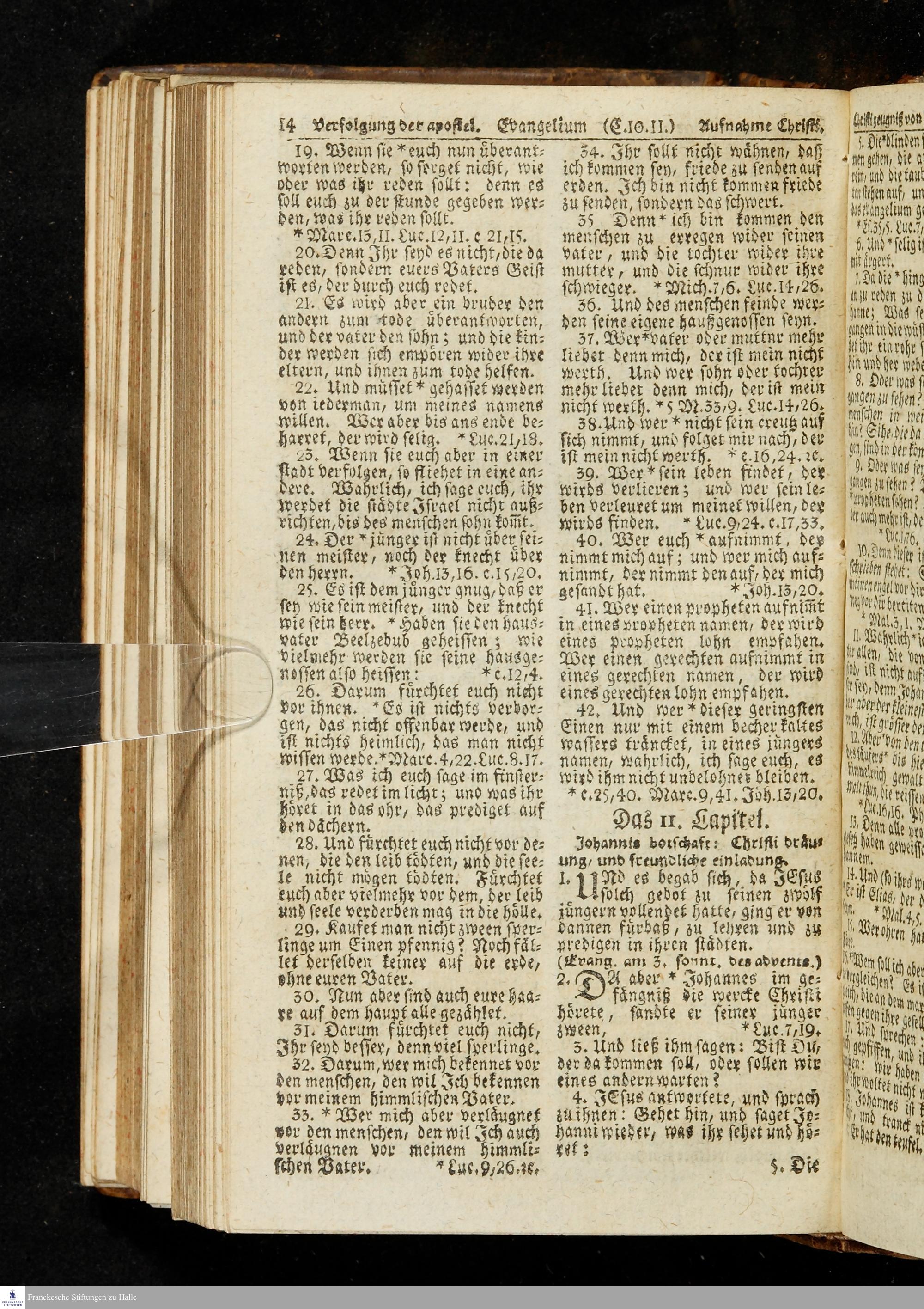 Biblia, Das ist: Die gantze Heil. Schrift Altes und Neues Testaments / Nach der Teutschen Ubersetzung D. Martin Luthers; Mit iedes Capitels kurtzen Summarien/ auch beygefügten vielen und richtigen Parallelen; Mit Fleiß übersehen, Und gegen einige/ sonderlich erstere/ Editiones des sel. Mannes gehalten, auch an unterschiedlichen Orten nach denselben eingerichtet, und von vielen in den bisherigen Exemplarien hin und wieder eingeschlichenen druckfehlern gesaubert. Nebst einer Vorrede Hn. Baron Carl Hildebrands v. Canstein.