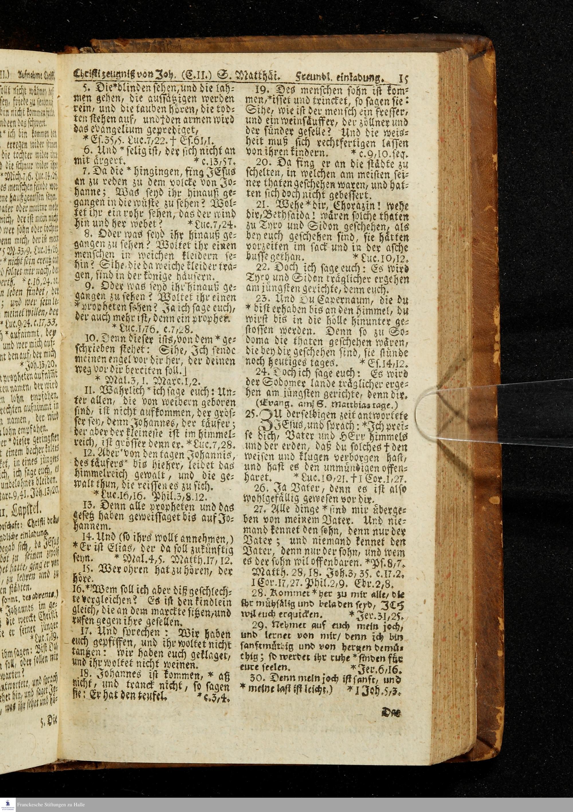 Biblia, Das ist: Die gantze Heil. Schrift Altes und Neues Testaments / Nach der Teutschen Ubersetzung D. Martin Luthers; Mit iedes Capitels kurtzen Summarien/ auch beygefügten vielen und richtigen Parallelen; Mit Fleiß übersehen, Und gegen einige/ sonderlich erstere/ Editiones des sel. Mannes gehalten, auch an unterschiedlichen Orten nach denselben eingerichtet, und von vielen in den bisherigen Exemplarien hin und wieder eingeschlichenen druckfehlern gesaubert. Nebst einer Vorrede Hn. Baron Carl Hildebrands v. Canstein.