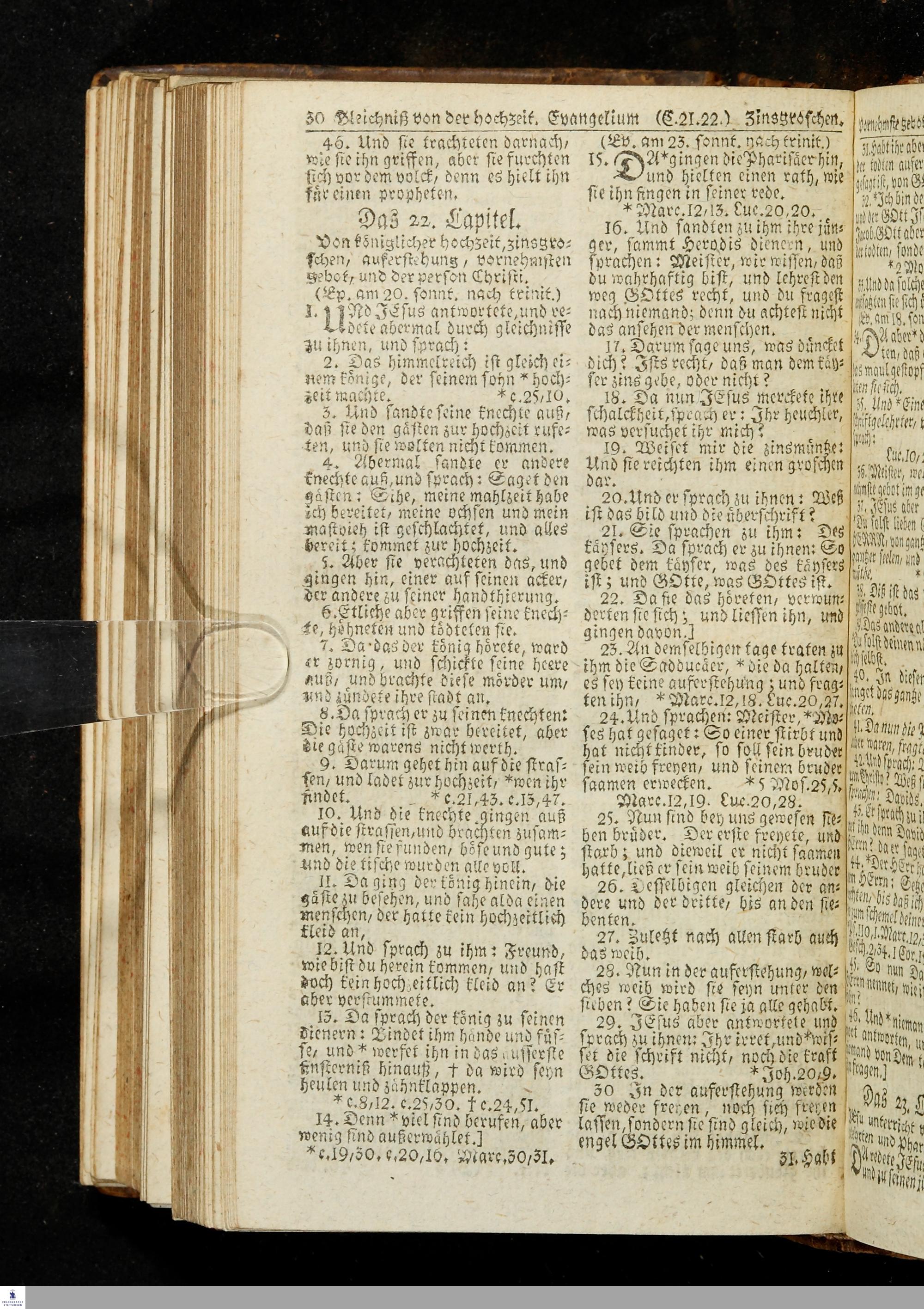 Biblia, Das ist: Die gantze Heil. Schrift Altes und Neues Testaments / Nach der Teutschen Ubersetzung D. Martin Luthers; Mit iedes Capitels kurtzen Summarien/ auch beygefügten vielen und richtigen Parallelen; Mit Fleiß übersehen, Und gegen einige/ sonderlich erstere/ Editiones des sel. Mannes gehalten, auch an unterschiedlichen Orten nach denselben eingerichtet, und von vielen in den bisherigen Exemplarien hin und wieder eingeschlichenen druckfehlern gesaubert. Nebst einer Vorrede Hn. Baron Carl Hildebrands v. Canstein.