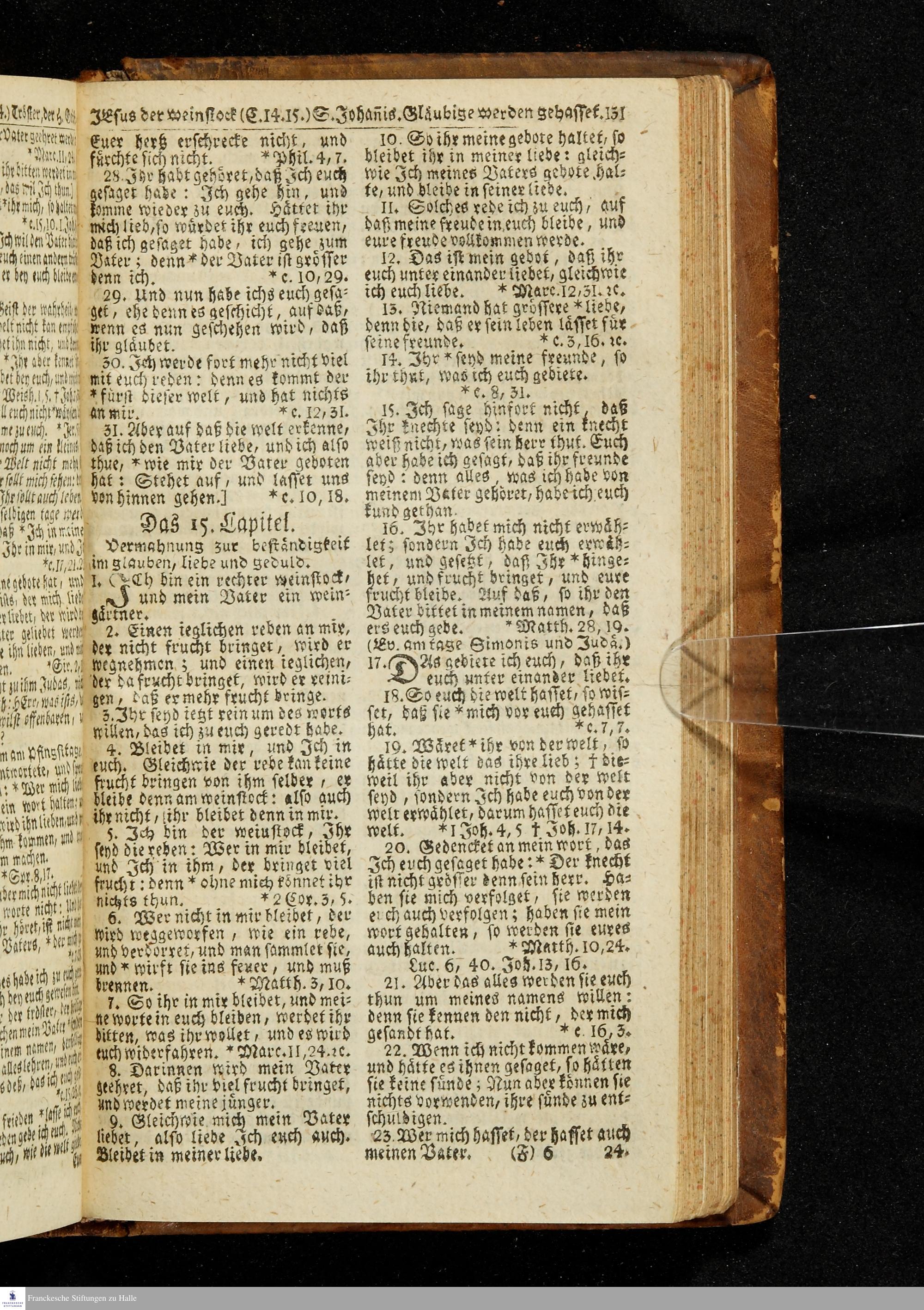 Biblia, Das ist: Die gantze Heil. Schrift Altes und Neues Testaments / Nach der Teutschen Ubersetzung D. Martin Luthers; Mit iedes Capitels kurtzen Summarien/ auch beygefügten vielen und richtigen Parallelen; Mit Fleiß übersehen, Und gegen einige/ sonderlich erstere/ Editiones des sel. Mannes gehalten, auch an unterschiedlichen Orten nach denselben eingerichtet, und von vielen in den bisherigen Exemplarien hin und wieder eingeschlichenen druckfehlern gesaubert. Nebst einer Vorrede Hn. Baron Carl Hildebrands v. Canstein.