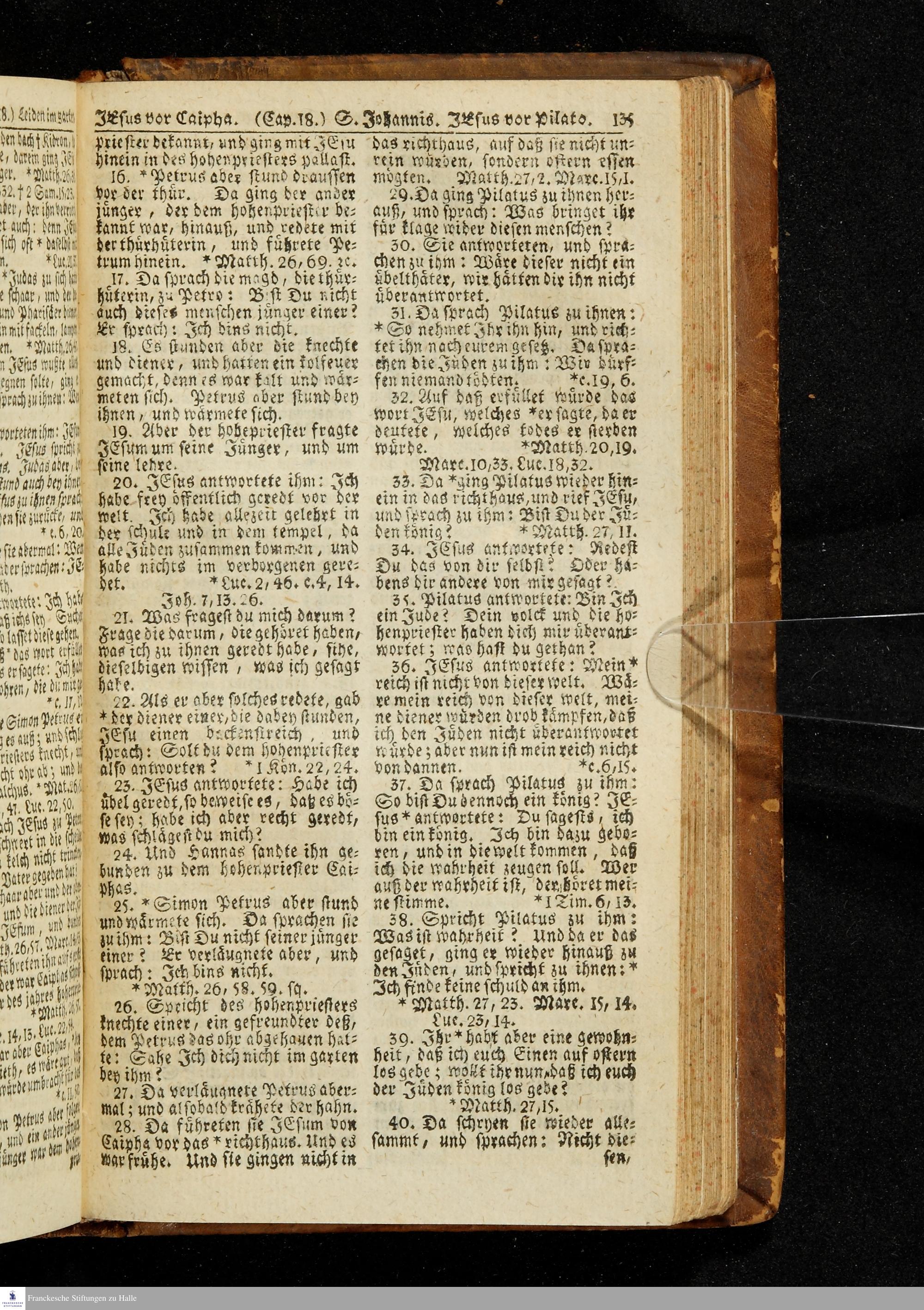 Biblia, Das ist: Die gantze Heil. Schrift Altes und Neues Testaments / Nach der Teutschen Ubersetzung D. Martin Luthers; Mit iedes Capitels kurtzen Summarien/ auch beygefügten vielen und richtigen Parallelen; Mit Fleiß übersehen, Und gegen einige/ sonderlich erstere/ Editiones des sel. Mannes gehalten, auch an unterschiedlichen Orten nach denselben eingerichtet, und von vielen in den bisherigen Exemplarien hin und wieder eingeschlichenen druckfehlern gesaubert. Nebst einer Vorrede Hn. Baron Carl Hildebrands v. Canstein.