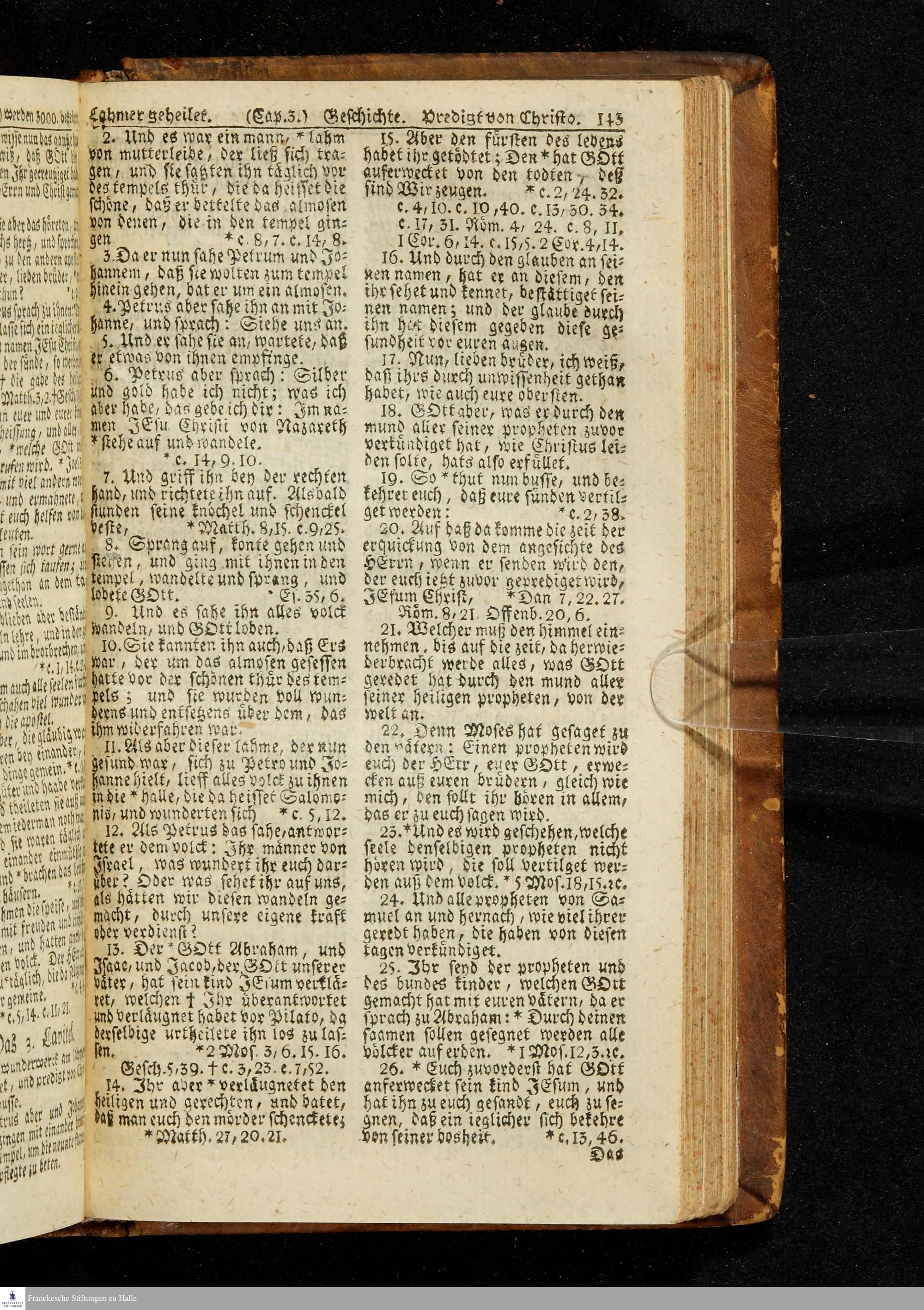 Biblia, Das ist: Die gantze Heil. Schrift Altes und Neues Testaments / Nach der Teutschen Ubersetzung D. Martin Luthers; Mit iedes Capitels kurtzen Summarien/ auch beygefügten vielen und richtigen Parallelen; Mit Fleiß übersehen, Und gegen einige/ sonderlich erstere/ Editiones des sel. Mannes gehalten, auch an unterschiedlichen Orten nach denselben eingerichtet, und von vielen in den bisherigen Exemplarien hin und wieder eingeschlichenen druckfehlern gesaubert. Nebst einer Vorrede Hn. Baron Carl Hildebrands v. Canstein.