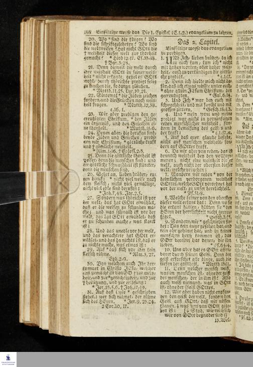 Biblia, Das ist: Die gantze Heil. Schrift Altes und Neues Testaments / Nach der Teutschen Ubersetzung D. Martin Luthers; Mit iedes Capitels kurtzen Summarien/ auch beygefügten vielen und richtigen Parallelen; Mit Fleiß übersehen, Und gegen einige/ sonderlich erstere/ Editiones des sel. Mannes gehalten, auch an unterschiedlichen Orten nach denselben eingerichtet, und von vielen in den bisherigen Exemplarien hin und wieder eingeschlichenen druckfehlern gesaubert. Nebst einer Vorrede Hn. Baron Carl Hildebrands v. Canstein.