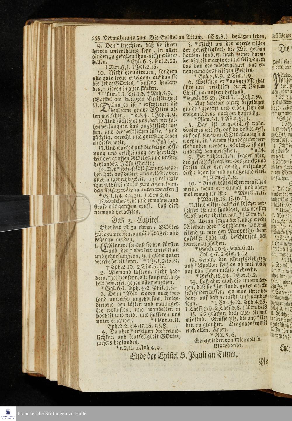 Biblia, Das ist: Die gantze Heil. Schrift Altes und Neues Testaments / Nach der Teutschen Ubersetzung D. Martin Luthers; Mit iedes Capitels kurtzen Summarien/ auch beygefügten vielen und richtigen Parallelen; Mit Fleiß übersehen, Und gegen einige/ sonderlich erstere/ Editiones des sel. Mannes gehalten, auch an unterschiedlichen Orten nach denselben eingerichtet, und von vielen in den bisherigen Exemplarien hin und wieder eingeschlichenen druckfehlern gesaubert. Nebst einer Vorrede Hn. Baron Carl Hildebrands v. Canstein.