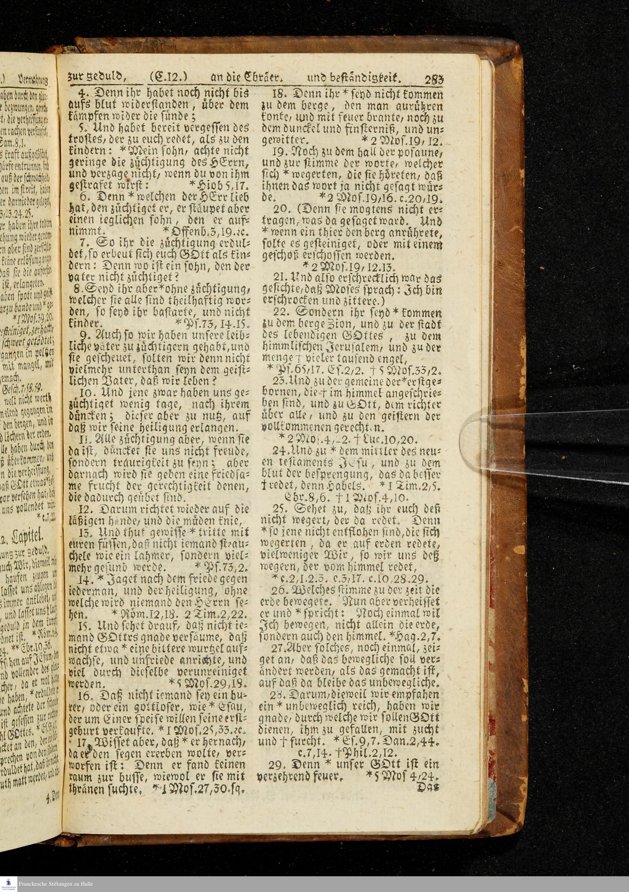 Biblia, Das ist: Die gantze Heil. Schrift Altes und Neues Testaments / Nach der Teutschen Ubersetzung D. Martin Luthers; Mit iedes Capitels kurtzen Summarien/ auch beygefügten vielen und richtigen Parallelen; Mit Fleiß übersehen, Und gegen einige/ sonderlich erstere/ Editiones des sel. Mannes gehalten, auch an unterschiedlichen Orten nach denselben eingerichtet, und von vielen in den bisherigen Exemplarien hin und wieder eingeschlichenen druckfehlern gesaubert. Nebst einer Vorrede Hn. Baron Carl Hildebrands v. Canstein.