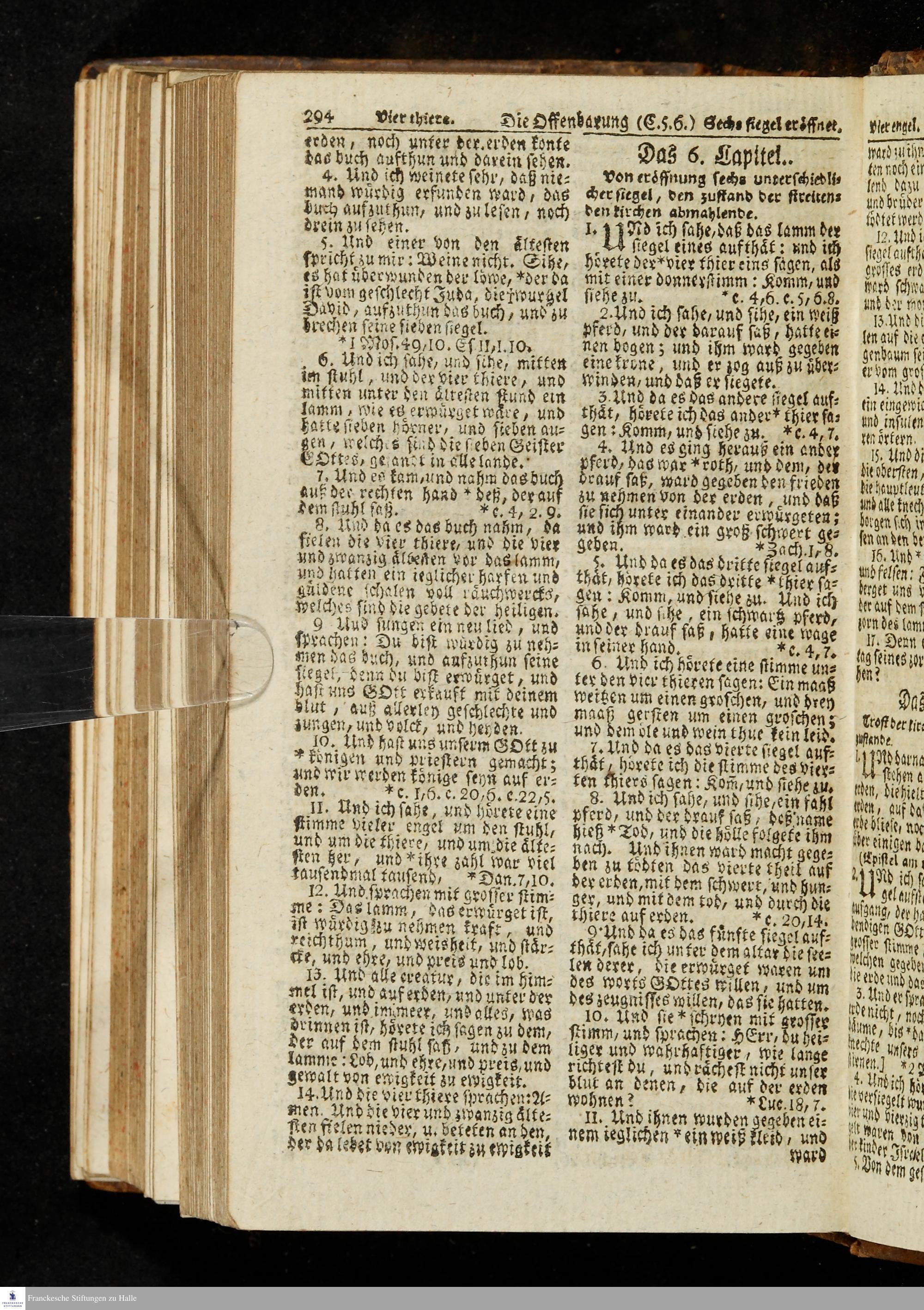 Biblia, Das ist: Die gantze Heil. Schrift Altes und Neues Testaments / Nach der Teutschen Ubersetzung D. Martin Luthers; Mit iedes Capitels kurtzen Summarien/ auch beygefügten vielen und richtigen Parallelen; Mit Fleiß übersehen, Und gegen einige/ sonderlich erstere/ Editiones des sel. Mannes gehalten, auch an unterschiedlichen Orten nach denselben eingerichtet, und von vielen in den bisherigen Exemplarien hin und wieder eingeschlichenen druckfehlern gesaubert. Nebst einer Vorrede Hn. Baron Carl Hildebrands v. Canstein.