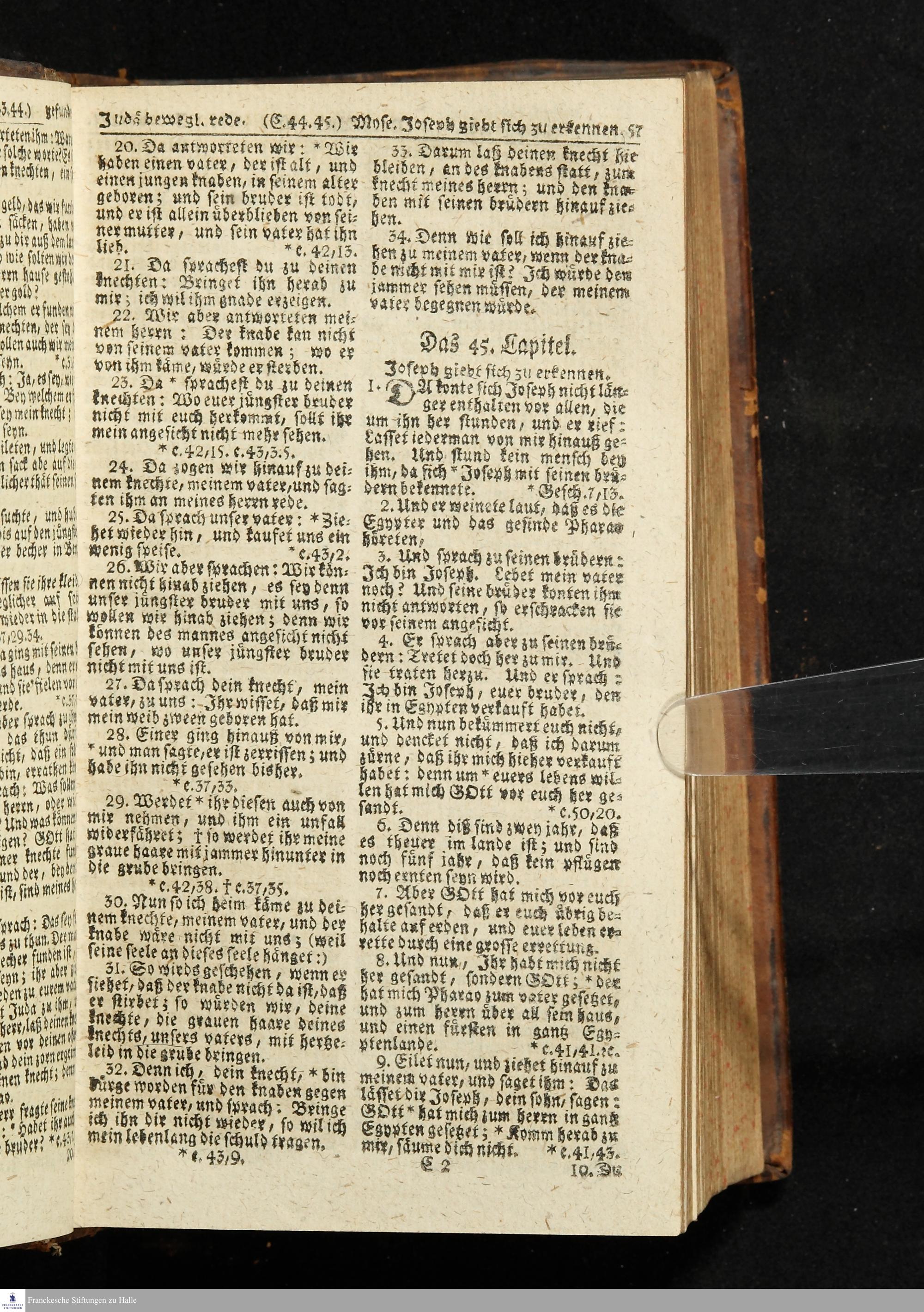 Biblia, Das ist: Die gantze Heil. Schrift Altes und Neues Testaments / Nach der Teutschen Ubersetzung D. Martin Luthers; Mit iedes Capitels kurtzen Summarien/ auch beygefügten vielen und richtigen Parallelen; Mit Fleiß übersehen, Und gegen einige/ sonderlich erstere/ Editiones des sel. Mannes gehalten, auch an unterschiedlichen Orten nach denselben eingerichtet, und von vielen in den bisherigen Exemplarien hin und wieder eingeschlichenen druckfehlern gesaubert. Nebst einer Vorrede Hn. Baron Carl Hildebrands v. Canstein.