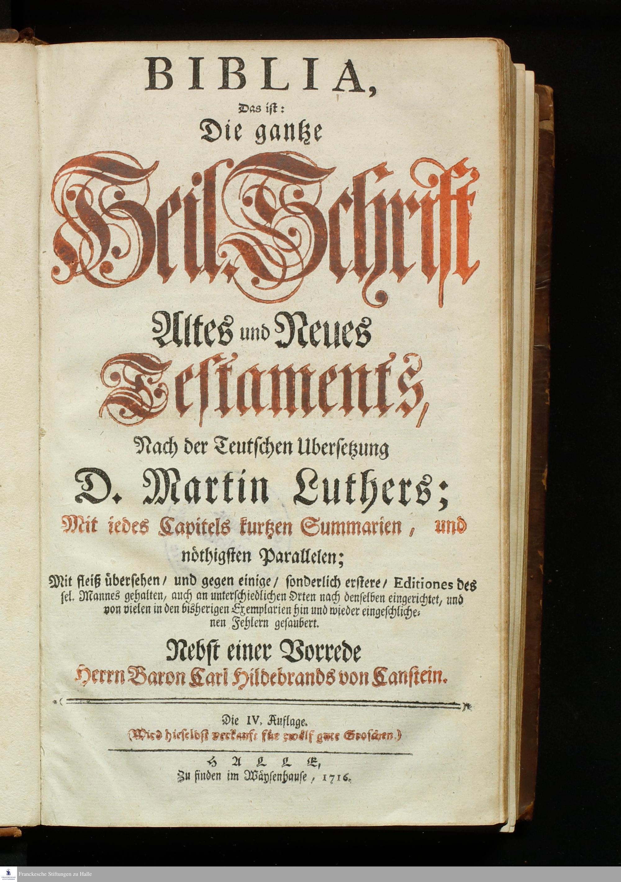 Biblia, Das ist: Die gantze Heil. Schrift Altes und Neues Testaments / Nach der Teutschen Ubersetzung D. Martin Luthers; Mit iedes Capitels kurtzen Summarien, und nöthigsten Parallelen; Mit fleiß übersehen, und gegen einige, sonderlich erstere, Editiones des sel. Mannes gehalten, auch an unterschiedlichen Orten nach denselben eingerichtet, und von vielen in den bisherigen Exemplarien hin und wieder eingeschlichenen Fehlern gesaubert. Nebst einer Vorrede Herrn Baron Carl Hildebrands von Canstein
