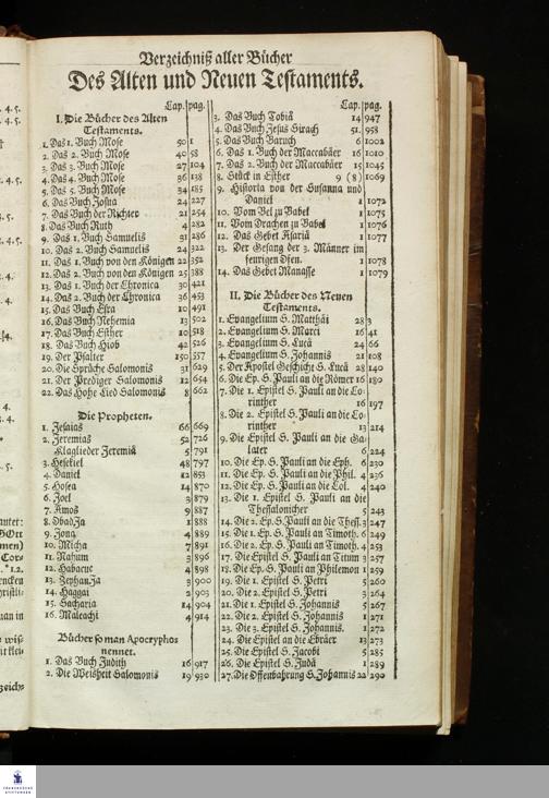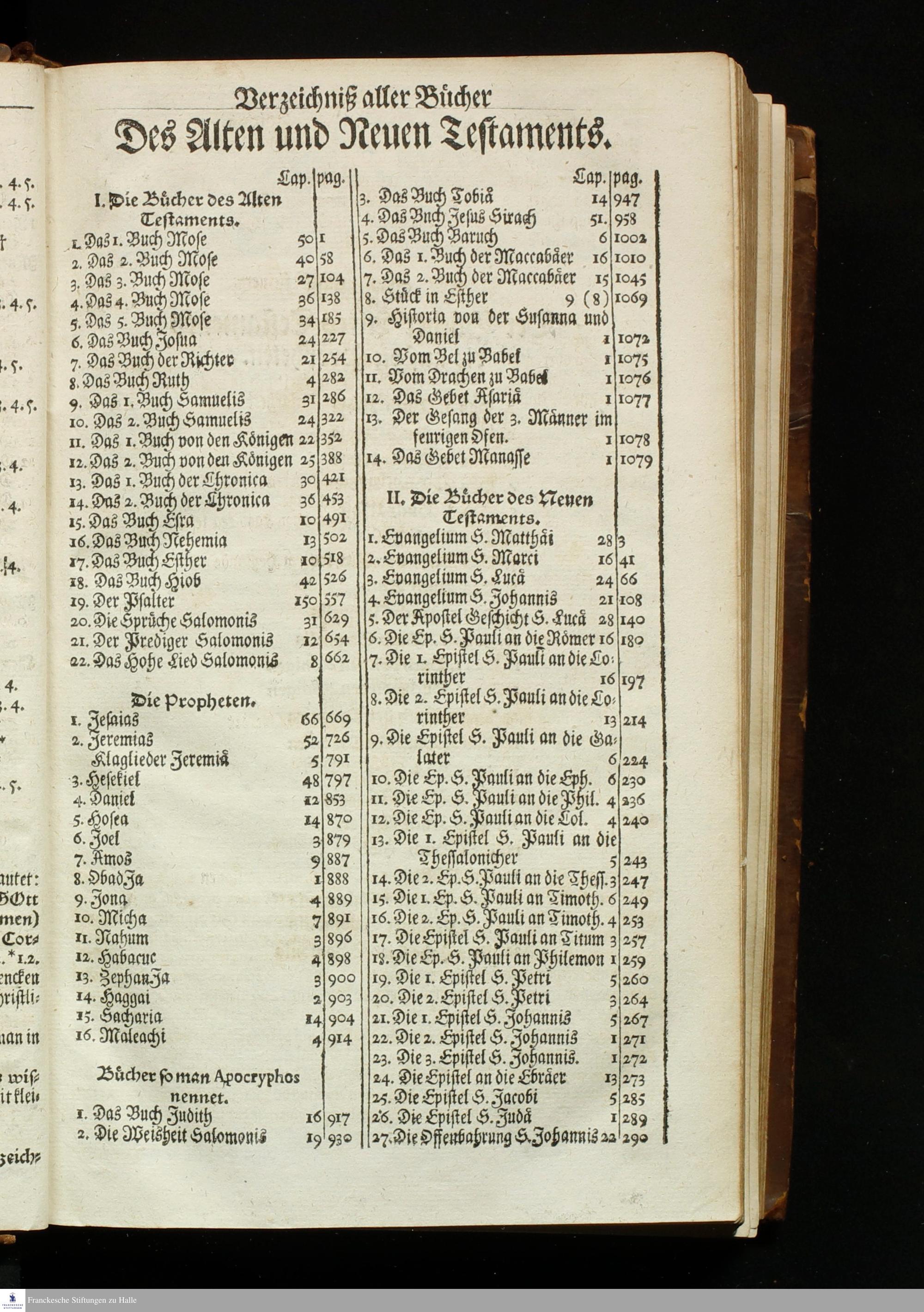 Biblia, Das ist: Die gantze Heil. Schrift Altes und Neues Testaments / Nach der Teutschen Ubersetzung D. Martin Luthers; Mit iedes Capitels kurtzen Summarien, und nöthigsten Parallelen; Mit fleiß übersehen, und gegen einige, sonderlich erstere, Editiones des sel. Mannes gehalten, auch an unterschiedlichen Orten nach denselben eingerichtet, und von vielen in den bisherigen Exemplarien hin und wieder eingeschlichenen Fehlern gesaubert. Nebst einer Vorrede Herrn Baron Carl Hildebrands von Canstein