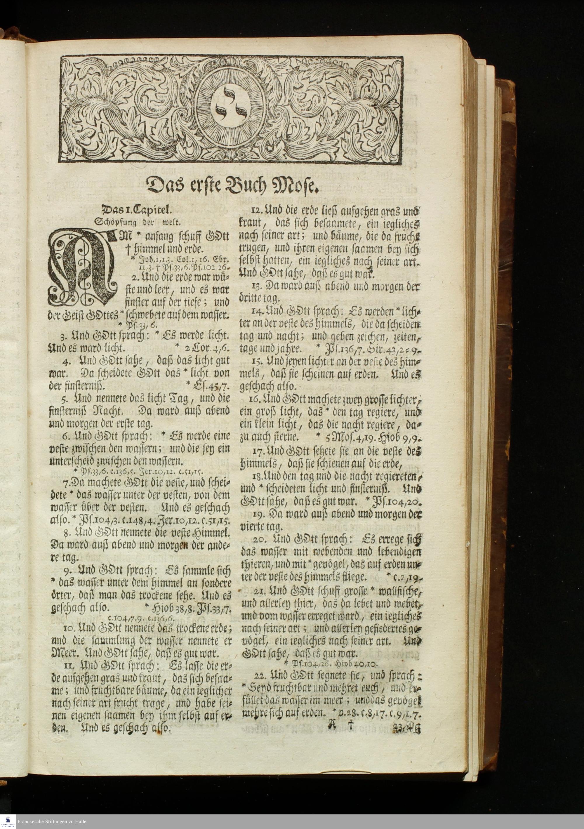 Biblia, Das ist: Die gantze Heil. Schrift Altes und Neues Testaments / Nach der Teutschen Ubersetzung D. Martin Luthers; Mit iedes Capitels kurtzen Summarien, und nöthigsten Parallelen; Mit fleiß übersehen, und gegen einige, sonderlich erstere, Editiones des sel. Mannes gehalten, auch an unterschiedlichen Orten nach denselben eingerichtet, und von vielen in den bisherigen Exemplarien hin und wieder eingeschlichenen Fehlern gesaubert. Nebst einer Vorrede Herrn Baron Carl Hildebrands von Canstein