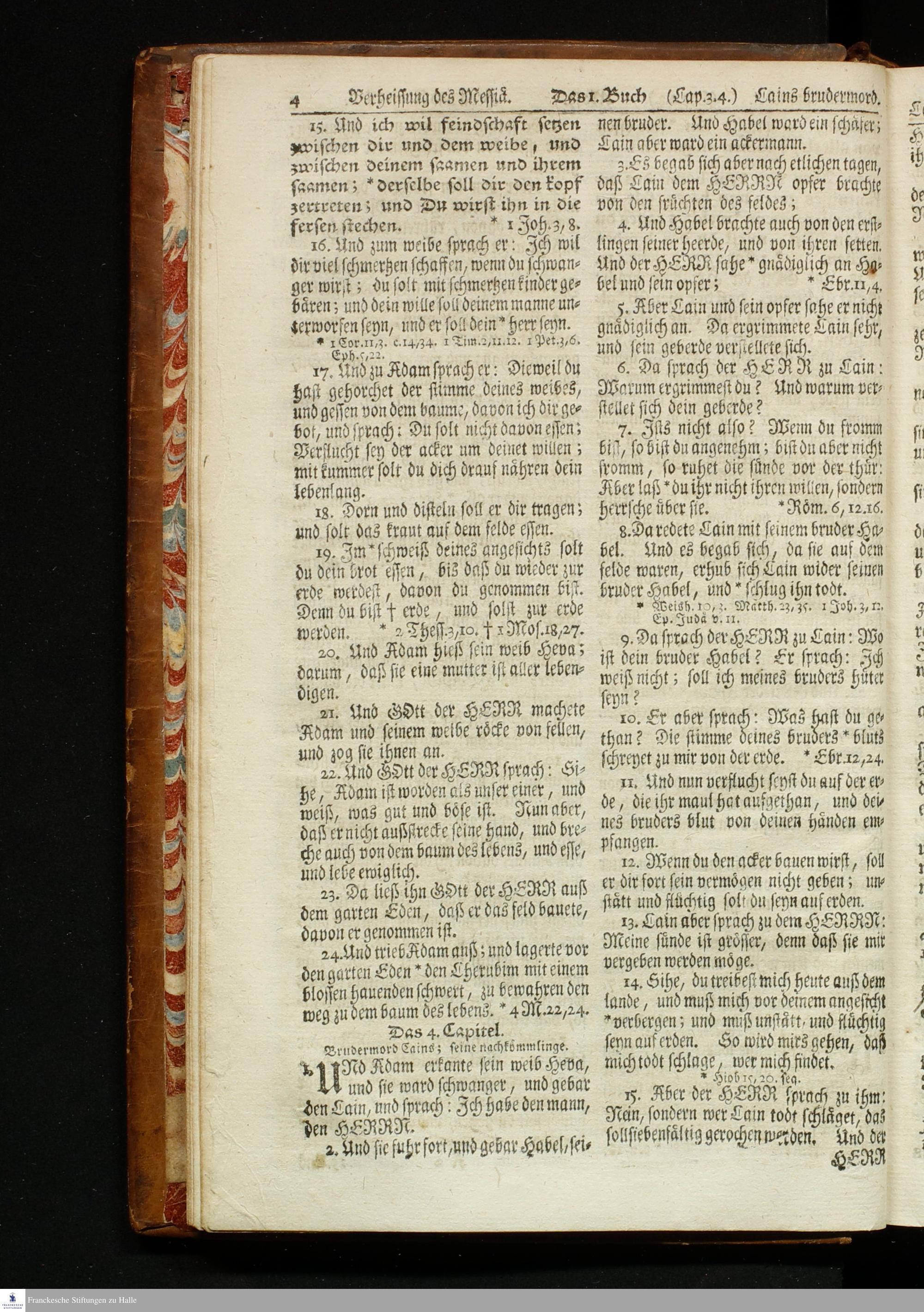 Biblia, Das ist: Die gantze Heil. Schrift Altes und Neues Testaments / Nach der Teutschen Ubersetzung D. Martin Luthers; Mit iedes Capitels kurtzen Summarien, und nöthigsten Parallelen; Mit fleiß übersehen, und gegen einige, sonderlich erstere, Editiones des sel. Mannes gehalten, auch an unterschiedlichen Orten nach denselben eingerichtet, und von vielen in den bisherigen Exemplarien hin und wieder eingeschlichenen Fehlern gesaubert. Nebst einer Vorrede Herrn Baron Carl Hildebrands von Canstein