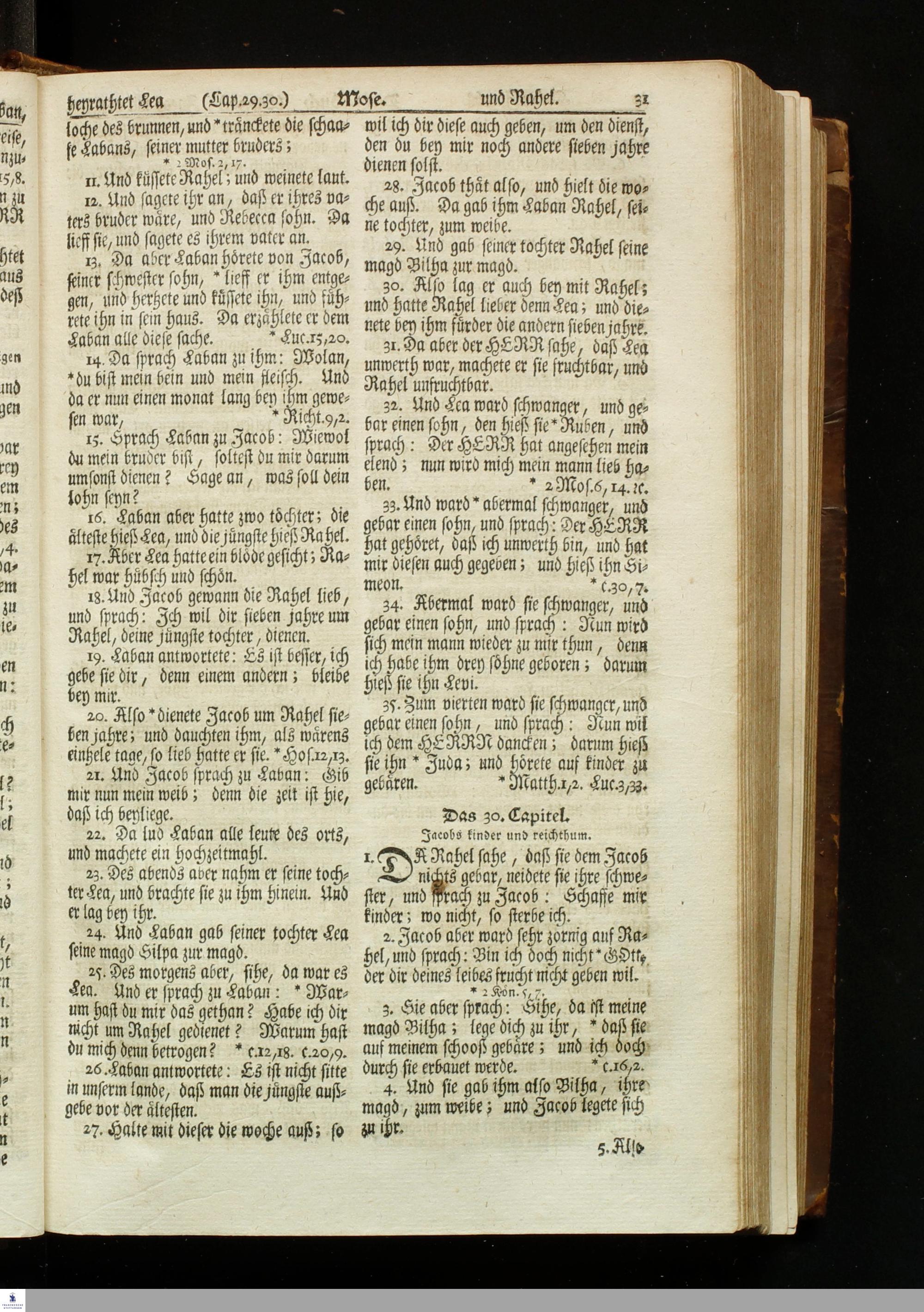 Biblia, Das ist: Die gantze Heil. Schrift Altes und Neues Testaments / Nach der Teutschen Ubersetzung D. Martin Luthers; Mit iedes Capitels kurtzen Summarien, und nöthigsten Parallelen; Mit fleiß übersehen, und gegen einige, sonderlich erstere, Editiones des sel. Mannes gehalten, auch an unterschiedlichen Orten nach denselben eingerichtet, und von vielen in den bisherigen Exemplarien hin und wieder eingeschlichenen Fehlern gesaubert. Nebst einer Vorrede Herrn Baron Carl Hildebrands von Canstein