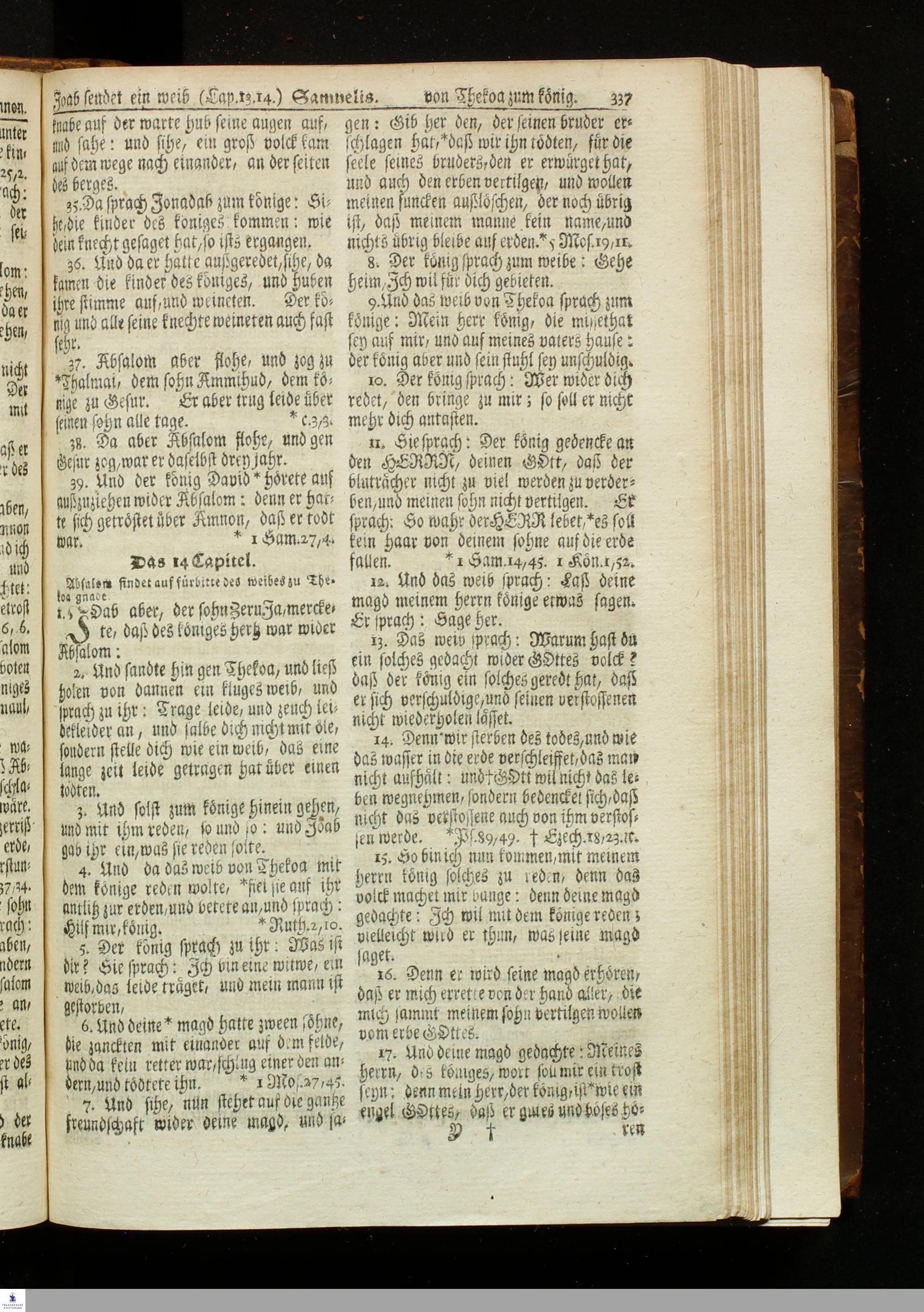 Biblia, Das ist: Die gantze Heil. Schrift Altes und Neues Testaments / Nach der Teutschen Ubersetzung D. Martin Luthers; Mit iedes Capitels kurtzen Summarien, und nöthigsten Parallelen; Mit fleiß übersehen, und gegen einige, sonderlich erstere, Editiones des sel. Mannes gehalten, auch an unterschiedlichen Orten nach denselben eingerichtet, und von vielen in den bisherigen Exemplarien hin und wieder eingeschlichenen Fehlern gesaubert. Nebst einer Vorrede Herrn Baron Carl Hildebrands von Canstein