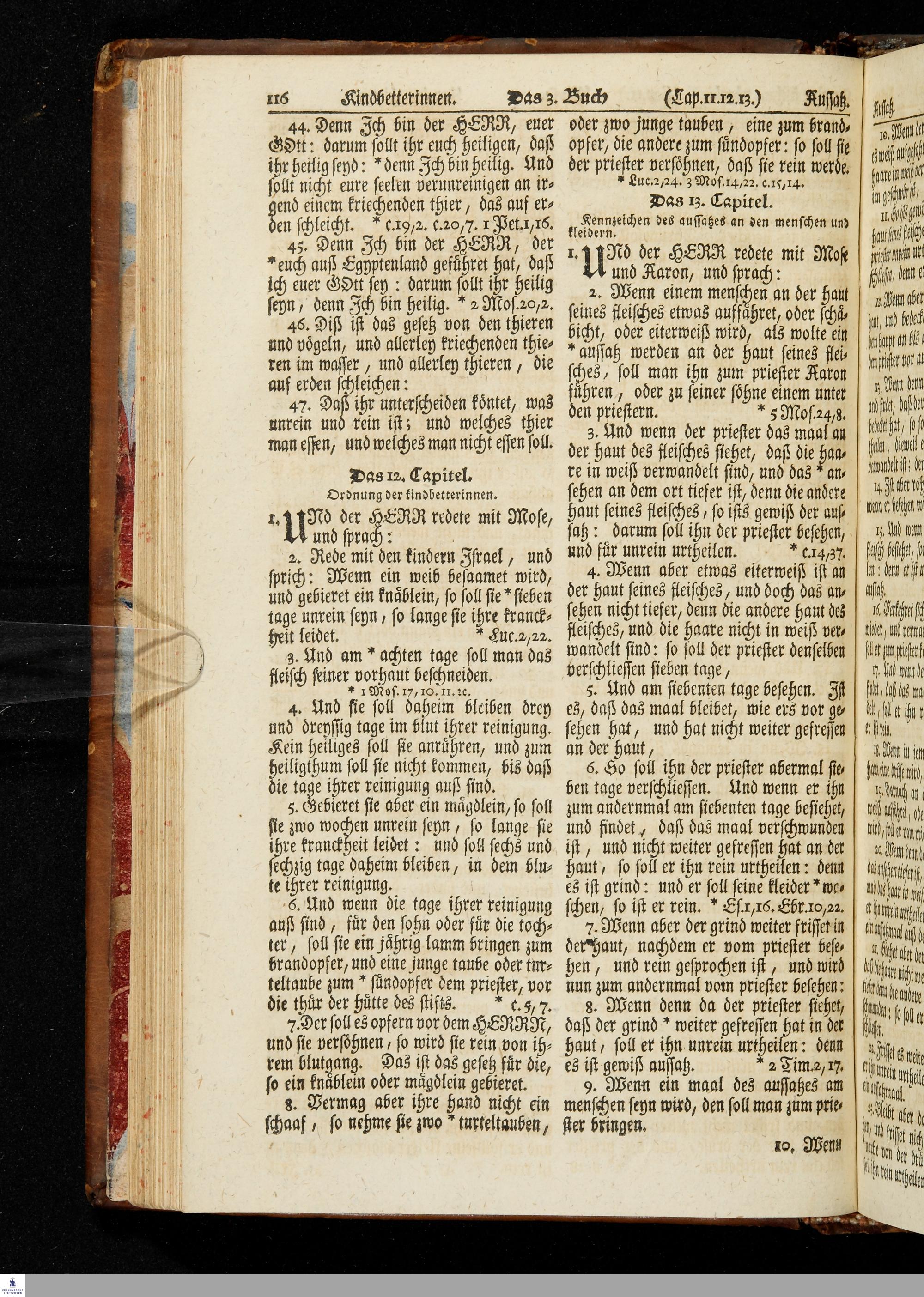 Biblia, Das ist: Die gantze Heil. Schrift Altes und Neues Testaments / Nach der Teutschen Ubersetzung D. Martin Luthers; Mit iedes Capitels kurtzen Summarien, auch beygefügten vielen und richtigen Parallelen; Mit fleiß übersehen/ und gegen einige/ sonderlich erstere/ Editiones des sel. Mannes gehalten, auch an unterschiedlichen Orten nach denselben eingerichtet, und von vielen in den bisherigen Exemplarien hin und wieder eingeschlichenen Fehlern gesaubert. Nebst der Vorrede Des S. Hn. Baron Carl Hildebrands von Canstein