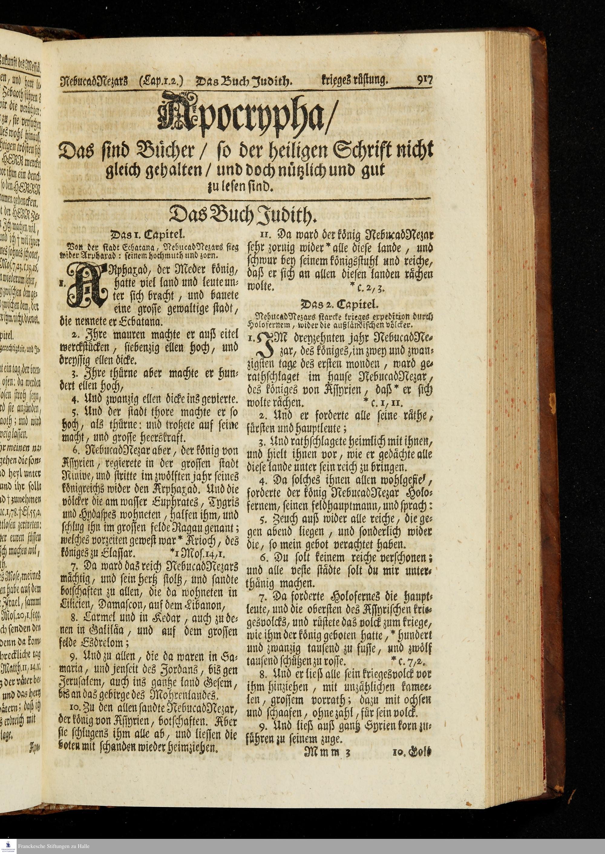 Biblia, Das ist: Die gantze Heil. Schrift Altes und Neues Testaments / Nach der Teutschen Ubersetzung D. Martin Luthers; Mit iedes Capitels kurtzen Summarien, auch beygefügten vielen und richtigen Parallelen; Mit fleiß übersehen/ und gegen einige/ sonderlich erstere/ Editiones des sel. Mannes gehalten, auch an unterschiedlichen Orten nach denselben eingerichtet, und von vielen in den bisherigen Exemplarien hin und wieder eingeschlichenen Fehlern gesaubert. Nebst der Vorrede Des S. Hn. Baron Carl Hildebrands von Canstein