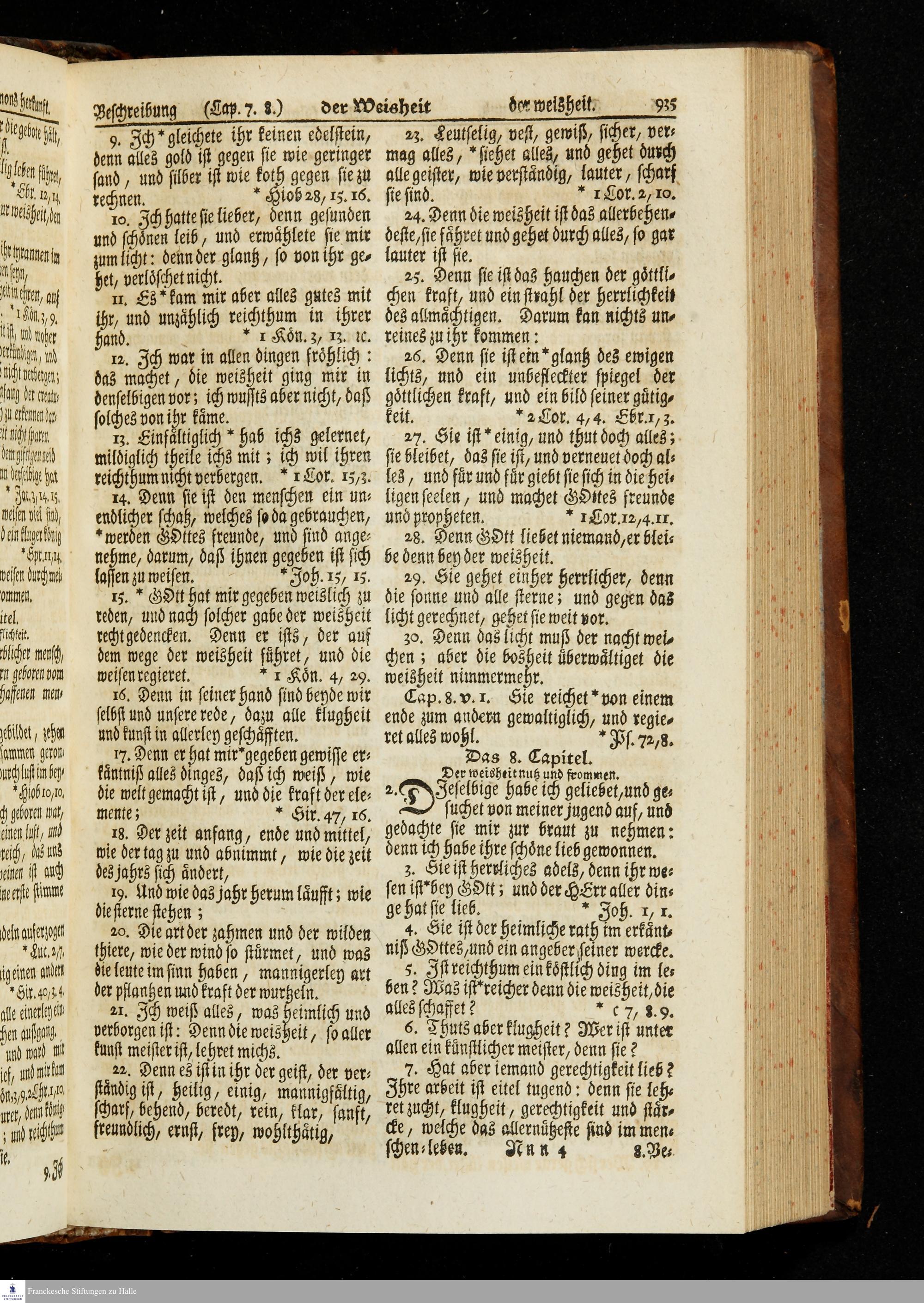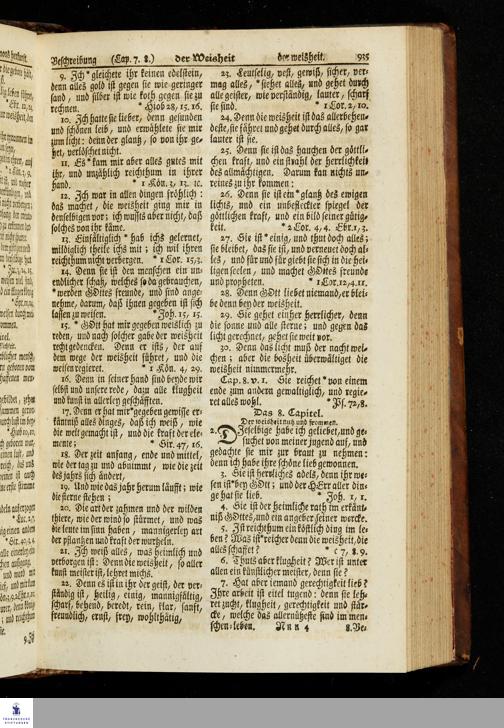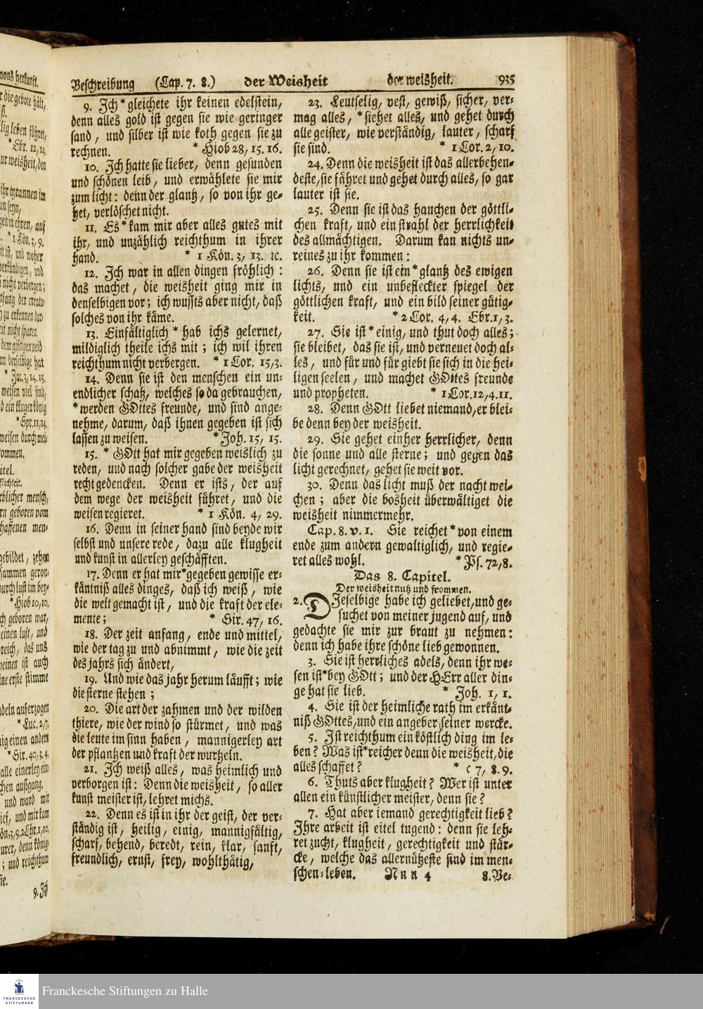 Biblia, Das ist: Die gantze Heil. Schrift Altes und Neues Testaments / Nach der Teutschen Ubersetzung D. Martin Luthers; Mit iedes Capitels kurtzen Summarien, auch beygefügten vielen und richtigen Parallelen; Mit fleiß übersehen/ und gegen einige/ sonderlich erstere/ Editiones des sel. Mannes gehalten, auch an unterschiedlichen Orten nach denselben eingerichtet, und von vielen in den bisherigen Exemplarien hin und wieder eingeschlichenen Fehlern gesaubert. Nebst der Vorrede Des S. Hn. Baron Carl Hildebrands von Canstein