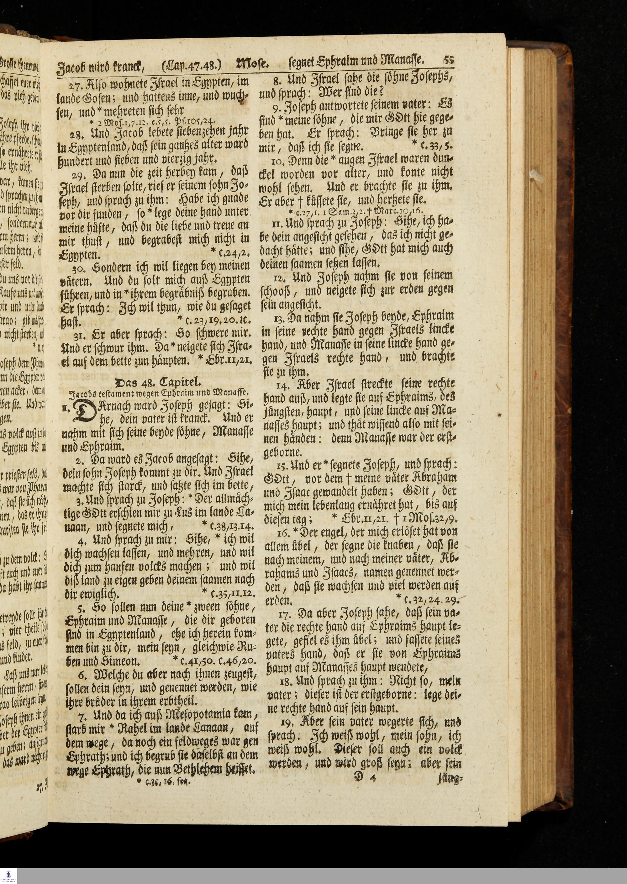 Biblia, Das ist: Die gantze Heil. Schrift Altes und Neues Testaments / Nach der Teutschen Ubersetzung D. Martin Luthers; Mit iedes Capitels kurtzen Summarien, auch beygefügten vielen und richtigen Parallelen; Mit fleiß übersehen/ und gegen einige/ sonderlich erstere/ Editiones des sel. Mannes gehalten, auch an unterschiedlichen Orten nach denselben eingerichtet, und von vielen in den bisherigen Exemplarien hin und wieder eingeschlichenen Fehlern gesaubert. Nebst der Vorrede Des S. Hn. Baron Carl Hildebrands von Canstein