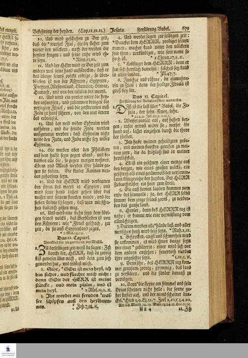 Biblia, Das ist: Die gantze Heil. Schrift Altes und Neues Testaments / Nach der Teutschen Ubersetzung D. Martin Luthers; Mit iedes Capitels kurtzen Summarien, auch beygefügten vielen und richtigen Parallelen; Mit fleiß übersehen/ und gegen einige/ sonderlich erstere/ Editiones des sel. Mannes gehalten, auch an unterschiedlichen Orten nach denselben eingerichtet, und von vielen in den bisherigen Exemplarien hin und wieder eingeschlichenen Fehlern gesaubert. Nebst der Vorrede Des S. Hn. Baron Carl Hildebrands von Canstein