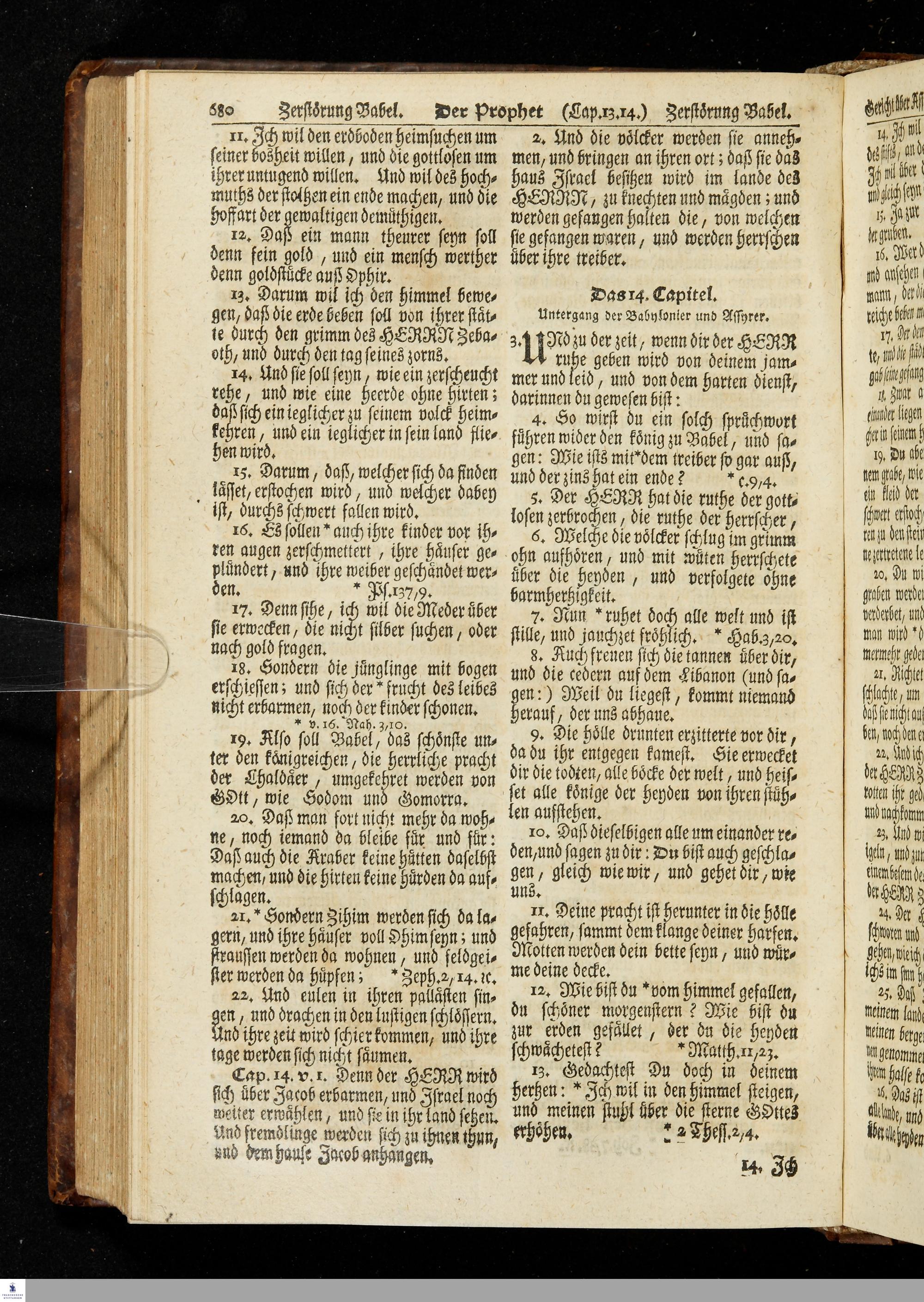 Biblia, Das ist: Die gantze Heil. Schrift Altes und Neues Testaments / Nach der Teutschen Ubersetzung D. Martin Luthers; Mit iedes Capitels kurtzen Summarien, auch beygefügten vielen und richtigen Parallelen; Mit fleiß übersehen/ und gegen einige/ sonderlich erstere/ Editiones des sel. Mannes gehalten, auch an unterschiedlichen Orten nach denselben eingerichtet, und von vielen in den bisherigen Exemplarien hin und wieder eingeschlichenen Fehlern gesaubert. Nebst der Vorrede Des S. Hn. Baron Carl Hildebrands von Canstein