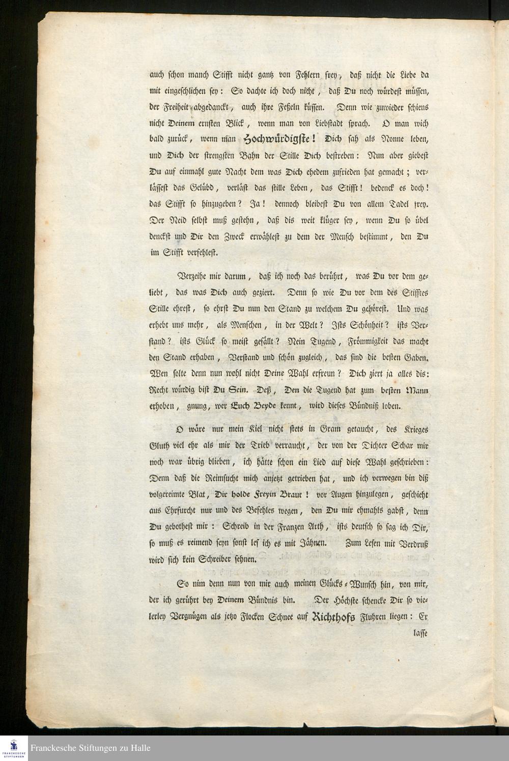 Hochwürdige! Hoch- und Wolgebohrne Freyin! Gnädige Freyin! So liebt denn in der Welt kein Stand die Freyheit mehr? ... / [Hochwürdige Dein treuer Diener bleibtT.]