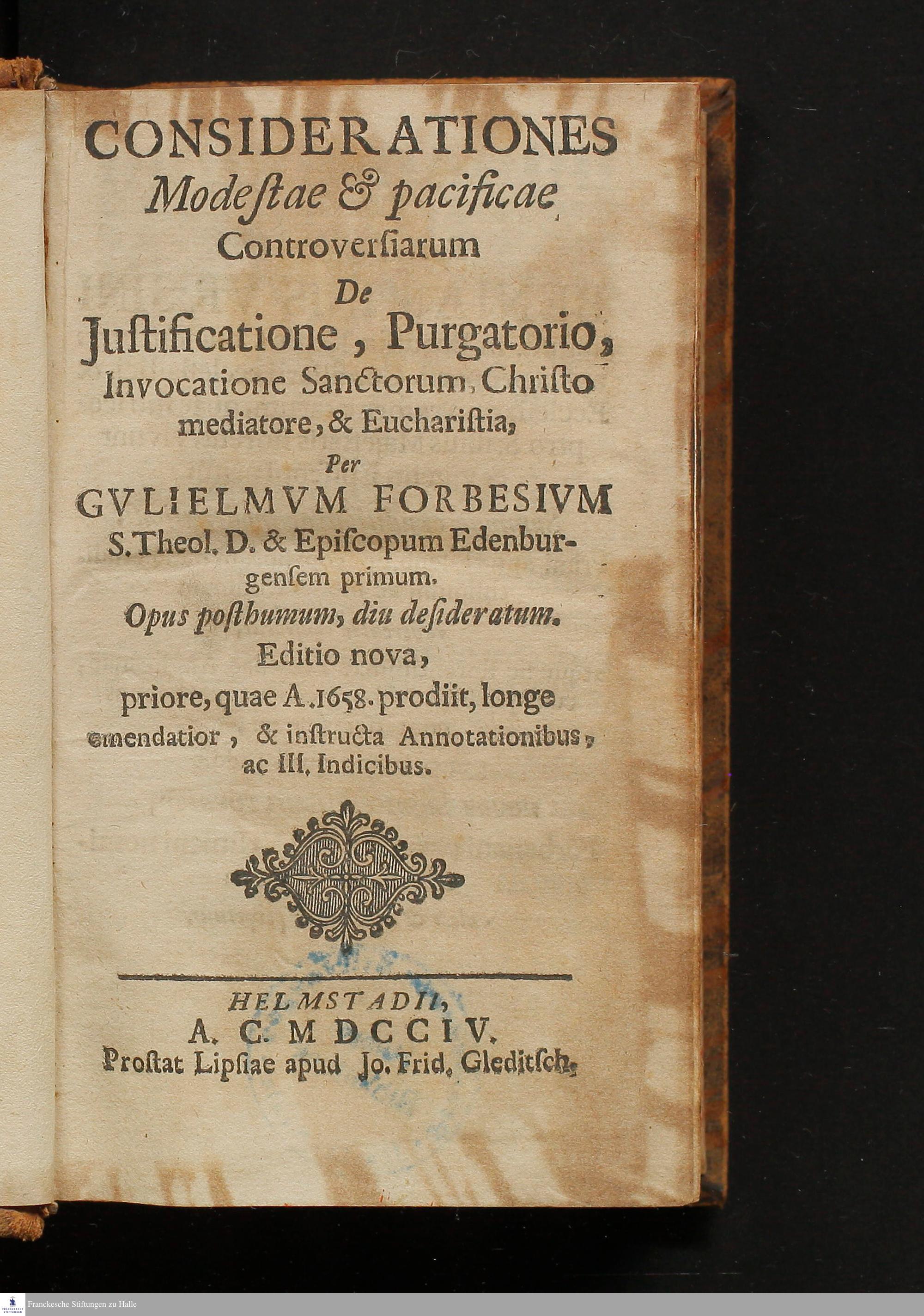 Considerationes Modestae & pacificae Controversiarum De Justificatione, Purgatorio, Invocatione Sanctorum, Christi mediatore, & Euchariastia / Per Gvilielmvm Forbesivm S. Theol. D. & Episcopum Edenburgensem primum.