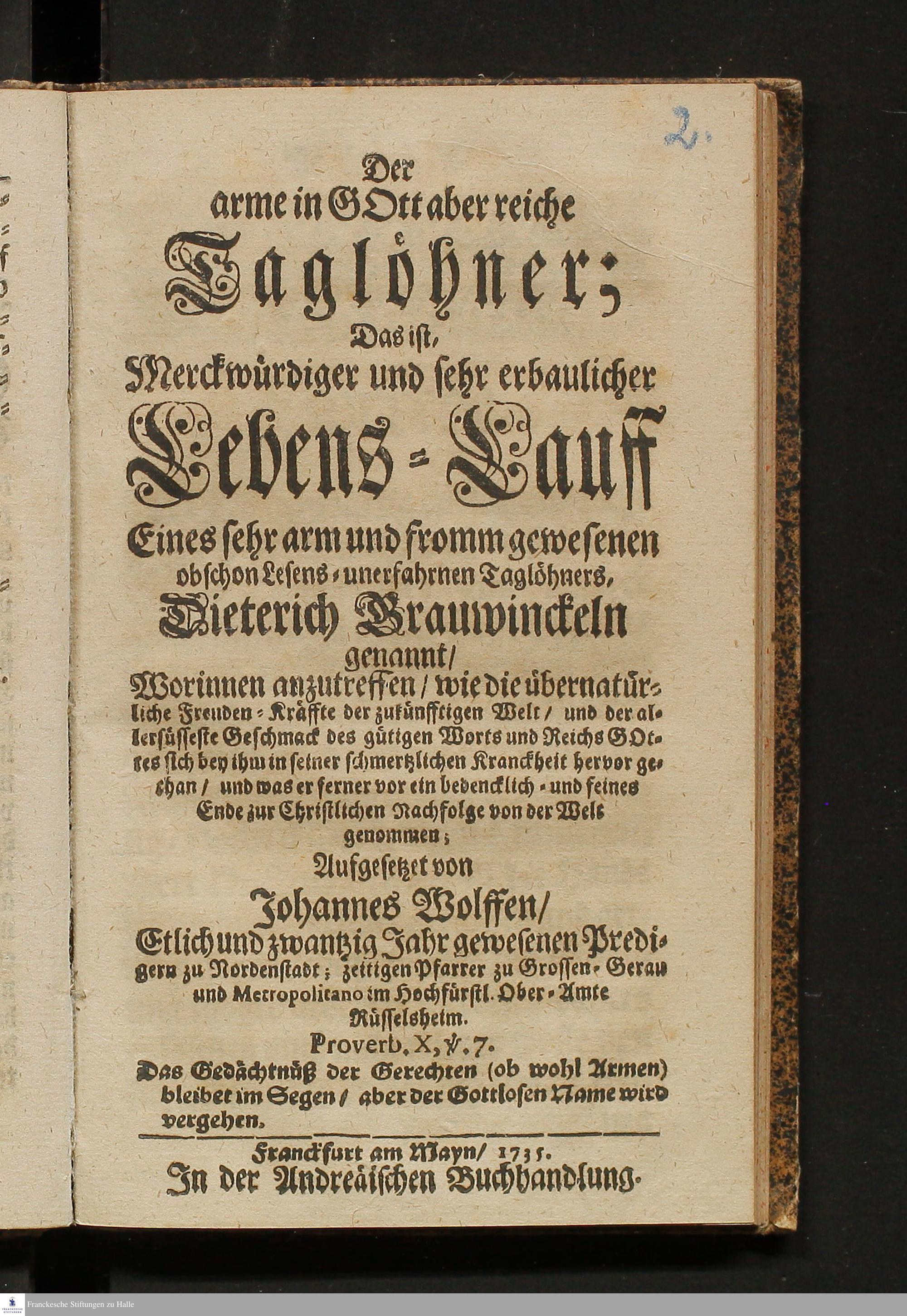 Der arme in GOtt aber reiche Tagelöhner; Das ist Merckwürdiger und sehr erbaulicher Lebens-Lauff Eines sehr arm und fromm gewesenen obschon Lesens-unerfahrnen Tagelöhners, Dieterich Grauwinckeln genannt/ Worinnen anzutreffen/ wie die übernatürliche Freuden-Kräffte der zukünfftigen Welt/ ... sich bey ihm in seiner schmertzlichen Kranckheit hervor gethan/ und was er ferner vor ein bedencklich- und feines Ende zur Christlichen Nachfolge von der Welt genommen / Aufgesetzet von Johannes Wolffen/ Etlich und zwantzig Jahr gewesenen Predigers zu Nordenstadt; zeitigen Pfarrer zu Grossen-Gerau und Metropolitano im Hochfürstl. Ober-Amte Rüsselsheim.