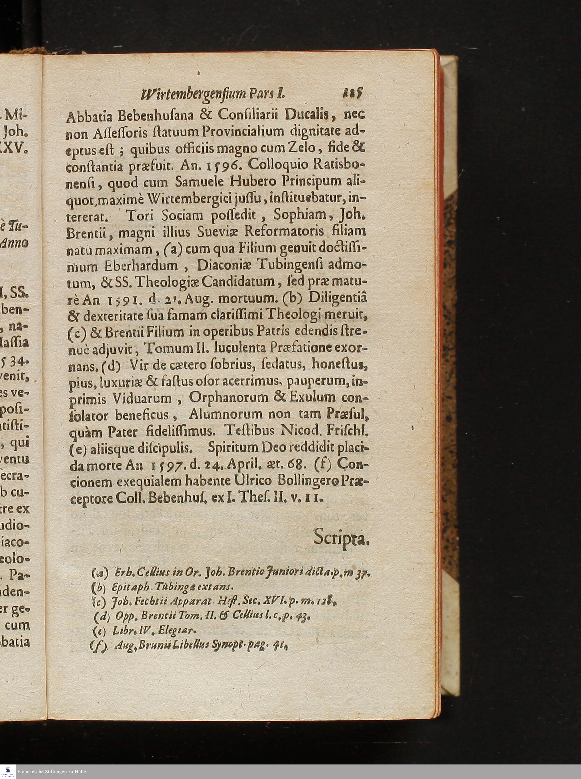 Pars 1 (1710) Memoria Theologorum Wirtembergensium Resuscitata, h. e. Biographia Praecipuorum Virorum, qui à tempore Reformationis usque ad hanc nostram aetatem partim in Ducatu Wirtembergico Verbum Domini docuerunt, partim extra suam hanc Patriam vocati Ecclesiae Christi aliis in terris inservierunt