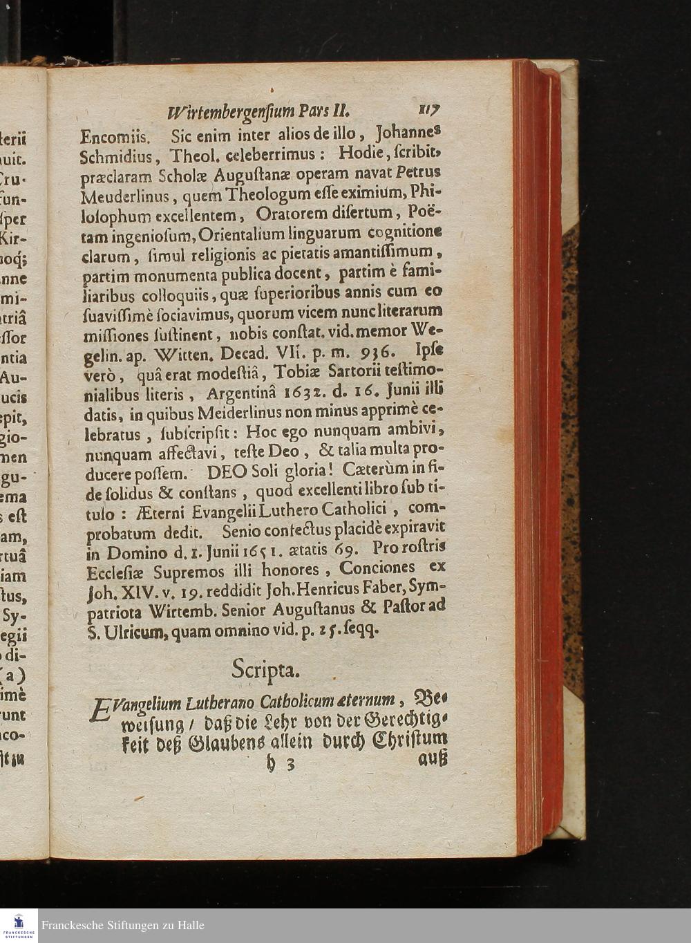 Pars II. (1709) Memoria Theologorum Wirtembergensium Resuscitata, h. e. Biographia Praecipuorum Virorum, qui à tempore Reformationis usque ad hanc nostram aetatem partim in Ducatu Wirtembergico Verbum Domini docuerunt, partim extra suam hanc Patriam vocati Ecclesiae Christi aliis in terris inservierunt