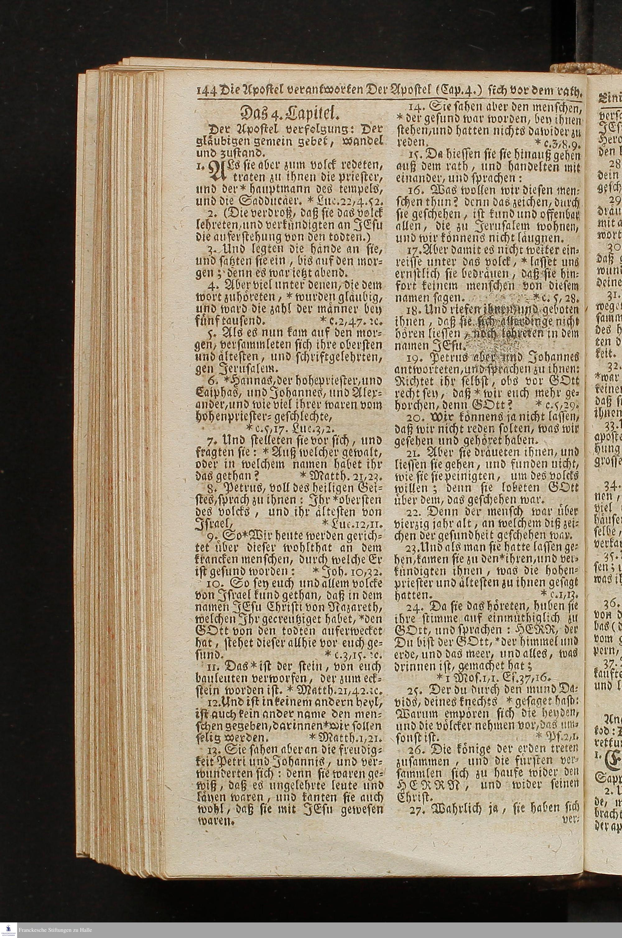 Biblia, Das ist: Die gantze Heil. Schrift Altes und Neues Testaments / Nach der Teutschen Ubersetzung D. Martin Luthers; Mit iedes Capitels kurtzen Summarien/ auch beygefügten vielen und richtigen Parallelen; Mit Fleiß übersehen, Und gegen einige, sonderlich erstere, Editiones des sel. Mannes gehalten, auch an unterschiedlichen Orten nach denselben eingerichtet, und von vielen in den bisherigen Exemplarien hin und wieder eingeschlichenen druckfehlern gesaubert. Nebst der Vorrede Des S. Hn. Baron C. H. von Canstein.