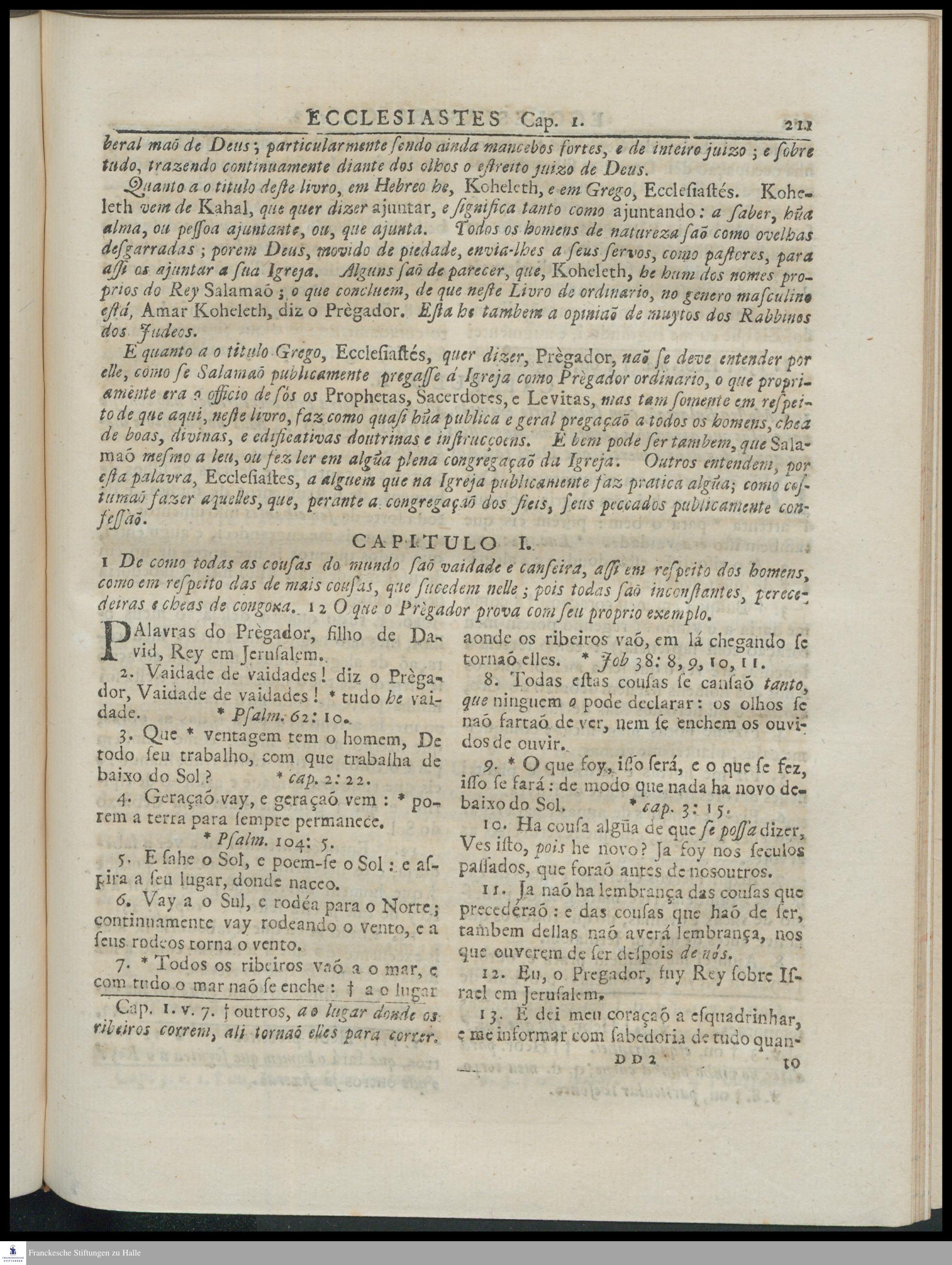 Os Livros Dogmaticos Do Velho Testamento, Convem A Saber, O Livro De Job, Os Psalmos De David, Os Proverbios De Salamaõ, O Ecclesiastes De Salamaõ, Os Cantares De Salamaõ / Traduzidos na Lingoa Portugueza Pelo Reverendo Padre Joam Ferreira A. D'Almeida, Ministro Pregador Do Santo Evangelho na Cidade de Batavia; Revistos e conferidos com o Texto Original Pelos Padres Missionarios De Trangambar.