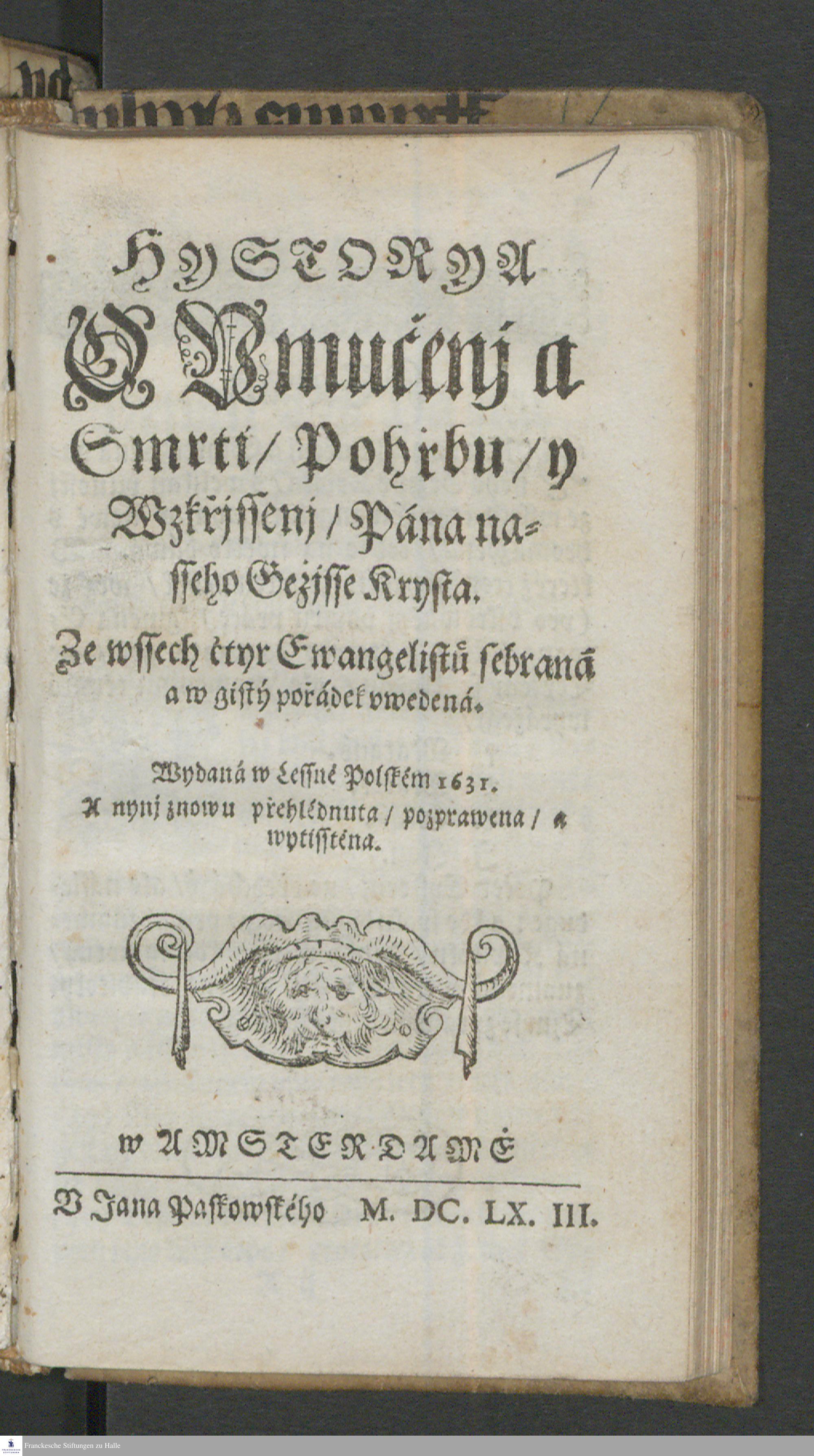 Hystorya O Vmucenj ́a Smrti/ Pohrbu/ y Wzkrjssenj/ Pána nasseho Gezjsse Krysta : Ze wssech ctyr Ewangelistu sebraná a w gistý porádek vwedená / [Johann Amos Comenius]