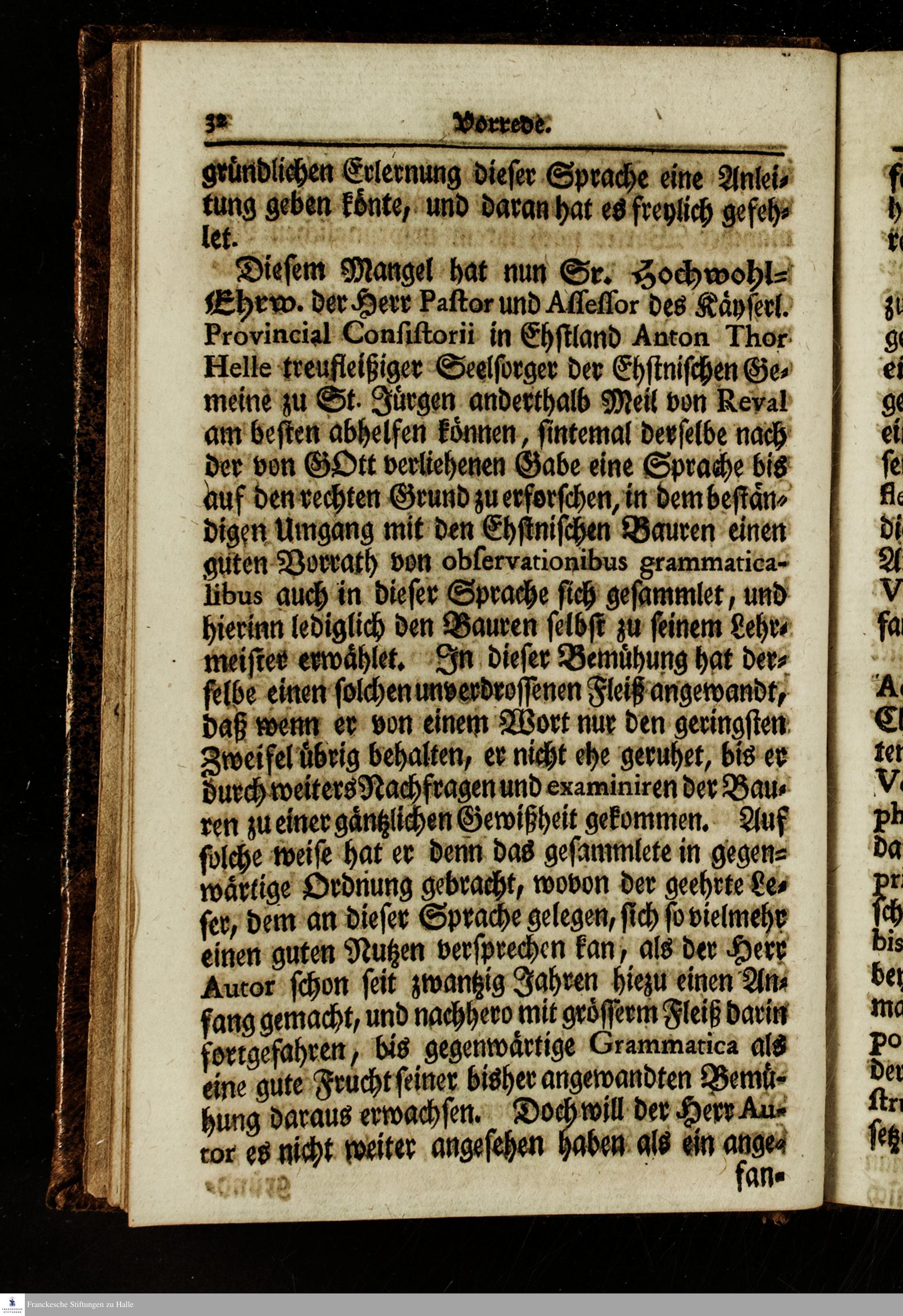 Kurtzgefaßte Anweisung Zur Ehstnischen Sprache : in welcher mitgetheilet werden I. Eine Grammatica. II. Ein Vocabvlarivm. III. Proverbia. IV. Ænigmata. V. Colloqvia ... ; Zur Anleitung Mit Fleiß zusammen getragen; un [!] nebst einem erwecklichen Sendschreiben ... Joh. Jacob Rambachs, ... an den Editorem, Auf Gutbefinden des Herrn Avtoris [Anton Thor Helle] / mit einer Vorrede herausgegeben von Eberhard Gutsleff, ..