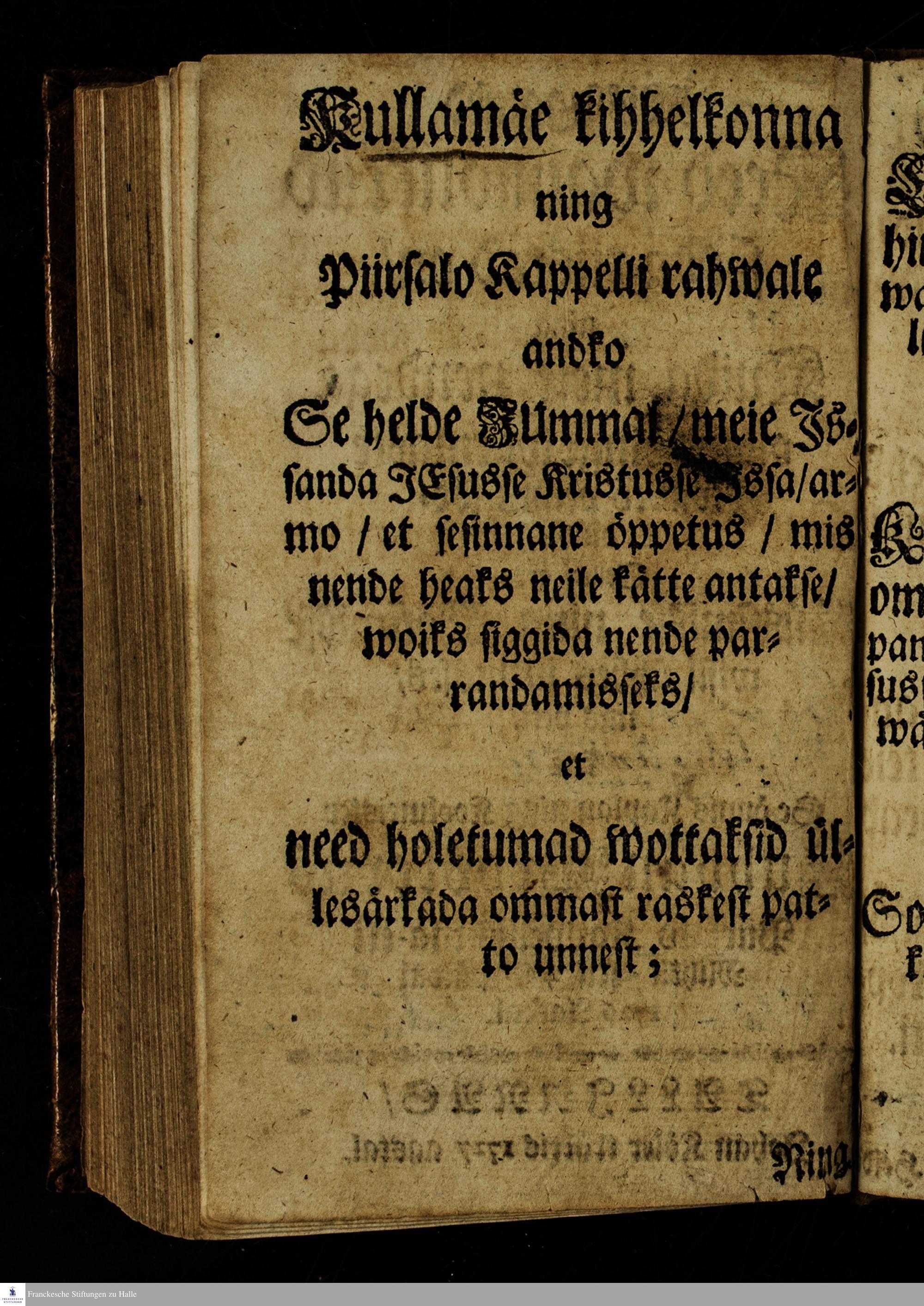 Missuggused Need waimolikkud södda-riistad on/ ning Kuida meie nendega omma hinge waenlase wasto peame söddima ... / Se önnis Kaplan ning Koolmeister Juhhan Mrosterus Piirsalo Kappellis ma-eti Mihkli-Ku 4mal päwal 1726 Aastal