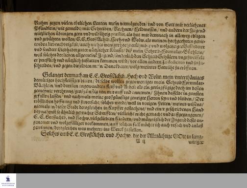 FormularBuch Von allerhand wolgebreüchlichen Teütschen vnd andern Zierschrifften : Dorine das gantze Fundament der Schreibkunst sampt zugehörigen wissenschaffte eröffnet / Dieser kunst begerenden zu nützlichem vnterricht sich dessen in manglung Mündlicher vnterweisung bequemlich zugebrauchen mit vleiß geordnet in Kupffer vnd zum Druck verlegt Durch Peter Stoyen Schreib: vnd Rechenmeister[n] in Leiptzigk Anno 1639