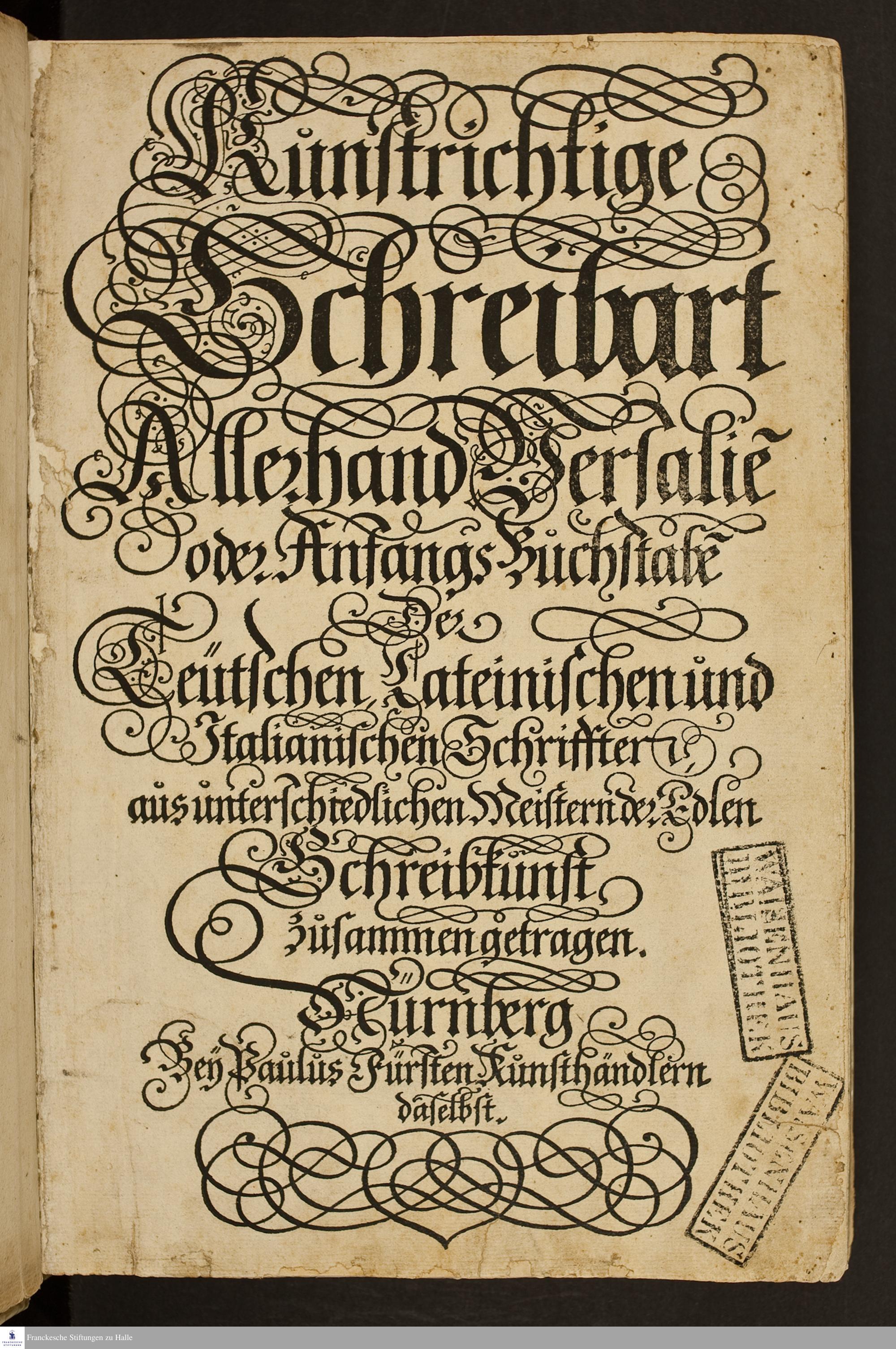 Kunstrichtige Schreibart Allerhand Versalie[n] oder AnfangsBuchstabe[n] Der Teütschen, Lateinischen und Italianischen Schrifften : aus unterschiedlichen Meistern der Edlen Schreibkunst zusammen getragen