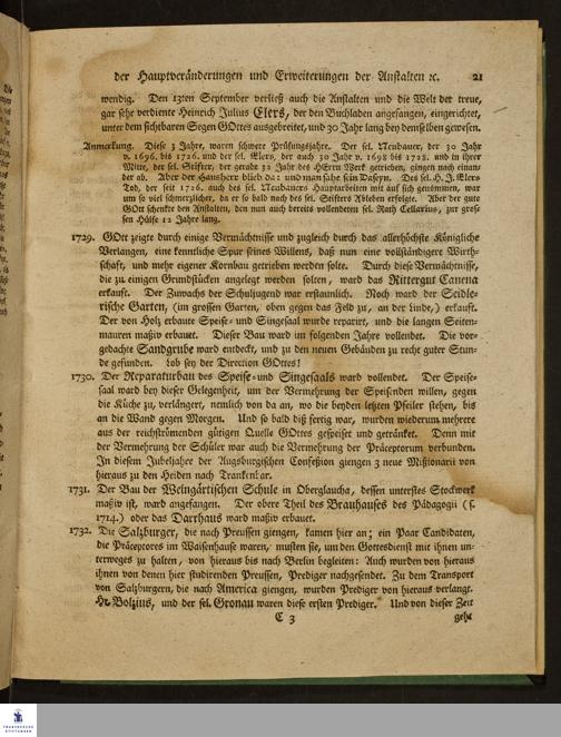 Chronologischer Abriß der Hauptveränderungen und Erweiterungen der Anstalten des Pädagogii regii und Waisenhauses von 1695 bis 1764. : in einer Einladungsschrift zu geneigter Gegenwart bey dem öffentlichen Examine welches im Königlichen Pädagogio den 12 und 13 April 1764. gehalten werden soll ... / vorgestellet von Johann Anton Niemeyer des Königlichen Pädagogii Jnspector