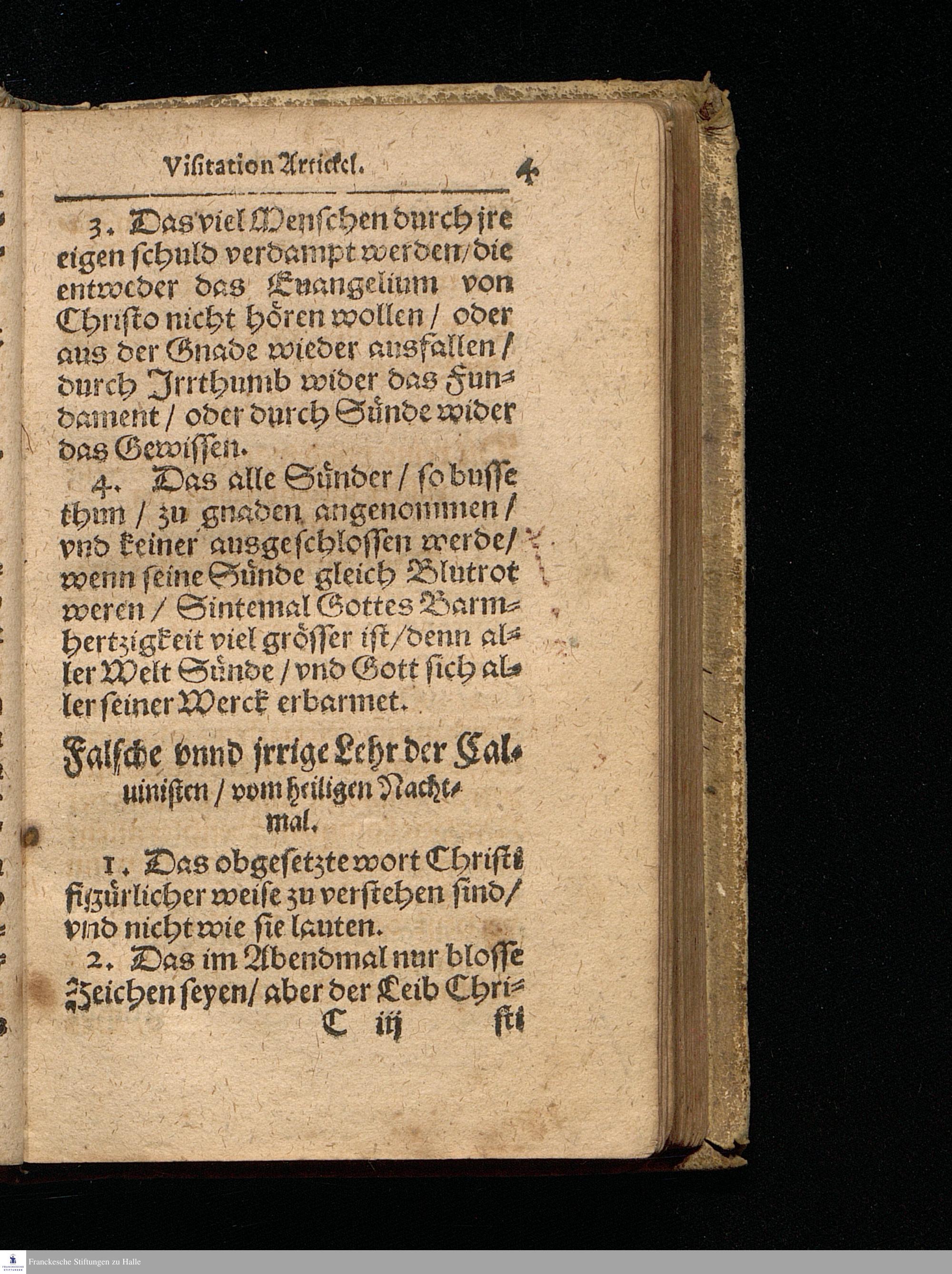 Gründliche || Verantwortung/|| Der || Vier Streitigen || Artickeln: Vom Heiligen || Abendmahl: Von der Person Christi:|| Von der H. Tauffe/ vnd Ewiger || F#ersehung Gottes.|| Wie dieselbige inn Theses || vnd Antitheses kürtzlich verfasset/ vnnd || in jungst verrichter Visitation der Kir=||chen vnd Schulen ... || der Chur Sachsen zu || vnterschreiben vorgelegt || worden.|| Gestellet || Durch die zu ermeldter Visitation || verordnete Theologen.||
