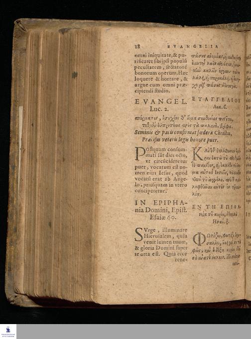 EUANGELIA TE || KAI EPISTOLAI TŌN KY-|| riakōn kaì heortastikōn hēmerōn hellenistì || kaì romaistì.||metà tōn distíchōn kyriakōn Christophórou Pelárgou hellenistì.|| EVANGELIA ET || EPISTOLAE DOMINI-||CORVM AC FESTORVM || dierum Græcè & Latinè.|| Vna cum distichis Dominicalibus Ioannis Stige-||lij, & festiualibus Bernhardi Bomgardij, correctius || quàm hactenus expressa.||
