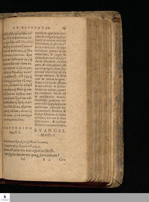 EUANGELIA TE || KAI EPISTOLAI TŌN KY-|| riakōn kaì heortastikōn hēmerōn hellenistì || kaì romaistì.||metà tōn distíchōn kyriakōn Christophórou Pelárgou hellenistì.|| EVANGELIA ET || EPISTOLAE DOMINI-||CORVM AC FESTORVM || dierum Græcè & Latinè.|| Vna cum distichis Dominicalibus Ioannis Stige-||lij, & festiualibus Bernhardi Bomgardij, correctius || quàm hactenus expressa.||
